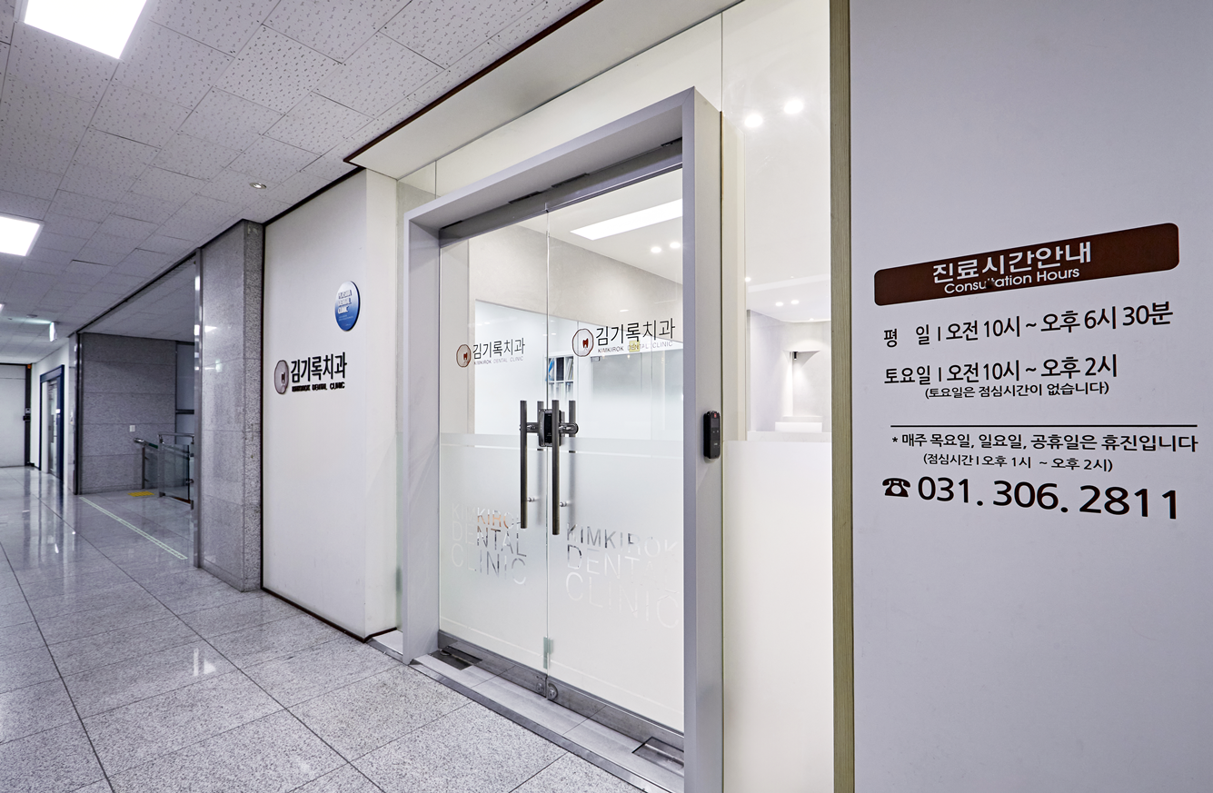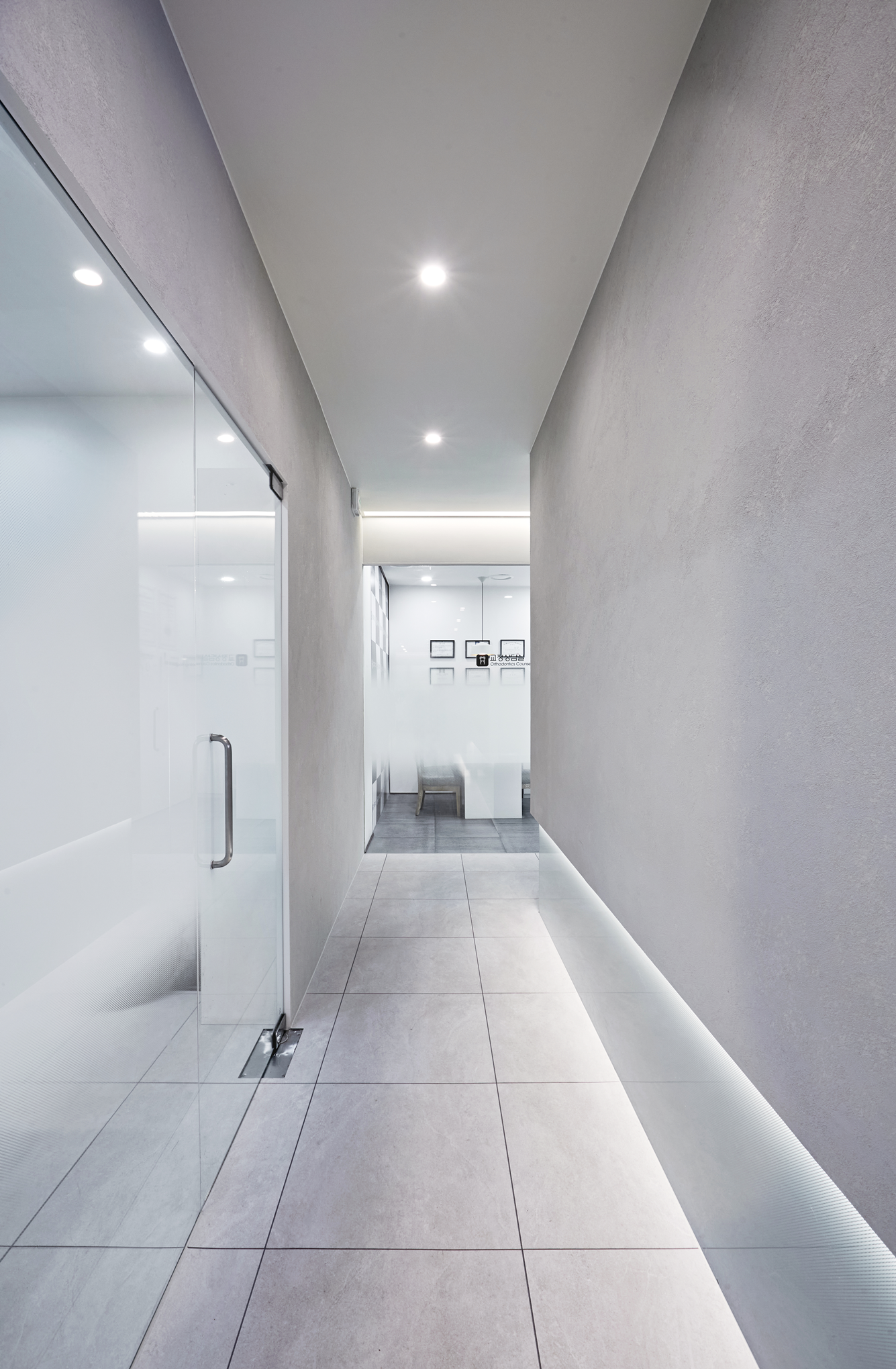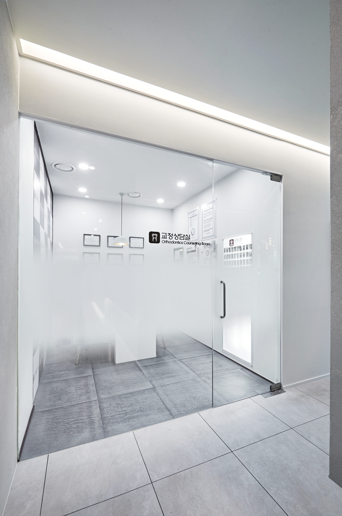 치과인테리어의 마지막 입구 파사드는 내부 분위기와 연결되는 깨끗하고 세련된 이미지를 그대로 살려주었습니다.