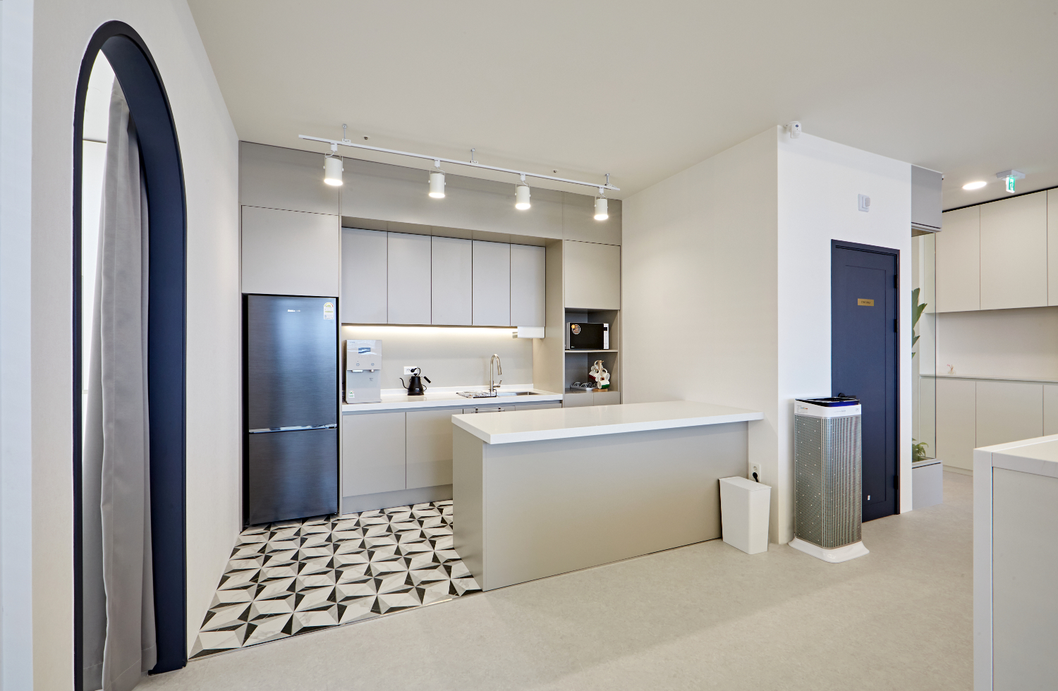 마지막으로 파주사무실인테리어의 카페테리아입니다. 역시 화이트와 그레이 그리고 네이비 색상의 조화를 중시하였는데요. 아일랜드 식탁 위로는 레일 조명을 설치하고, 뒷면의 수납장은 은은한 그레이 색상으로 도시적인 느낌을 내었습니다.