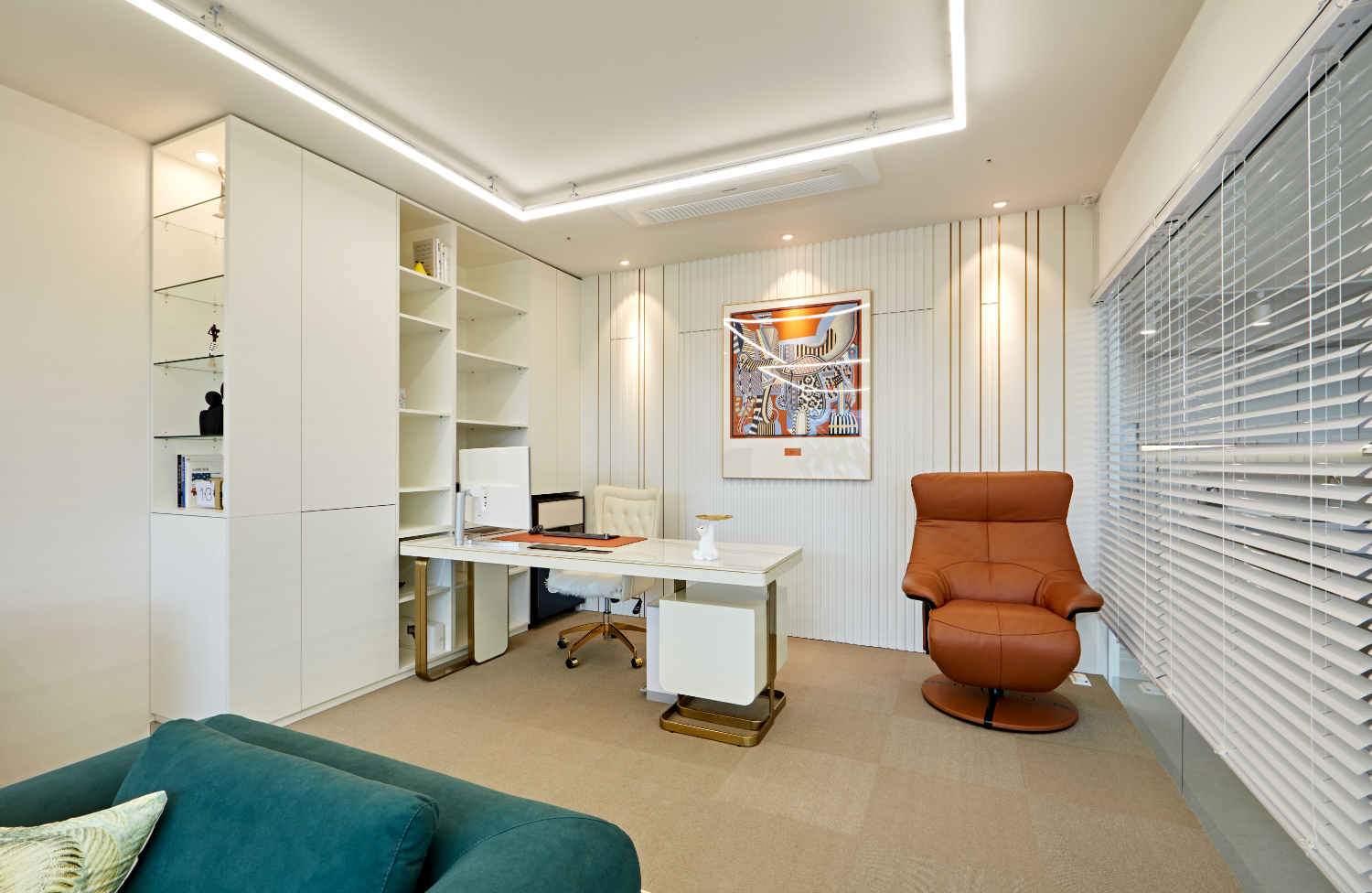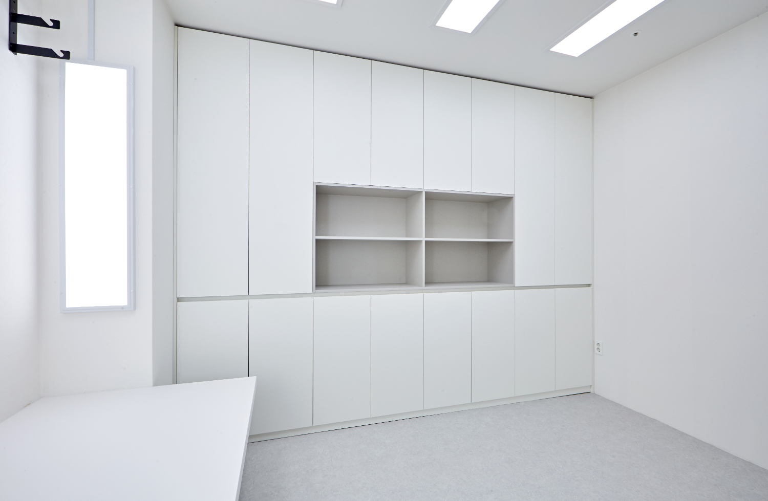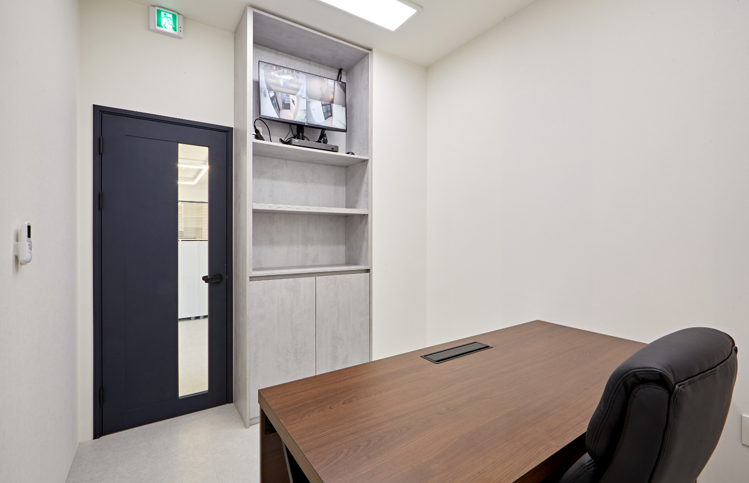개인 사무실 안에는 미니멀한 느낌의 인테리어가 되어 있는데요. 가장 눈에 띄는 것은 특이한 질감의 소재로 만들어진 책장입니다. 전체적으로 모던한 분위기를 통일감 있게 가져가기 위한 선택이었습니다.
