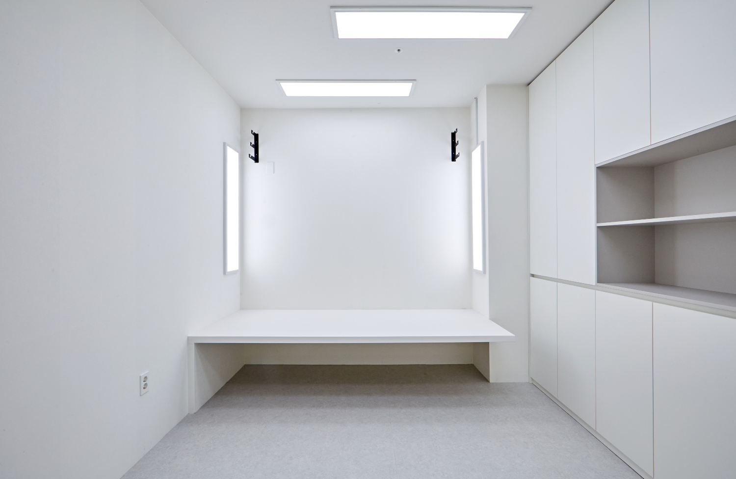 간단하게 마련된 휴게공간에는 필요한 물품을 수납할 수 있는 빌트인 수납장과 함께 쇼파가 마련되어 있습니다. 여기는 그레이톤으로 통일하여서 모던한 느낌을 내주고 있고, 쇼파에 앉아서 정면을 바라보면 전체 벽면이 정원으로 된 곳을 마주할 수 있는데요. 이는 더욱더 안락함을 느끼게 하는 장치라 할 수 있습니다.