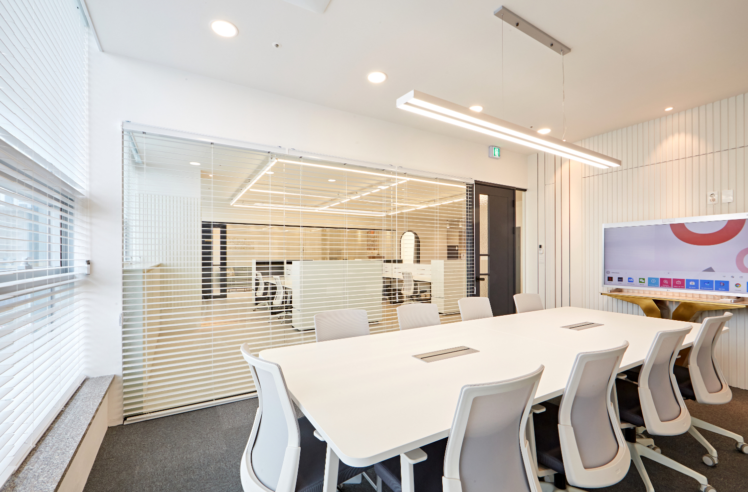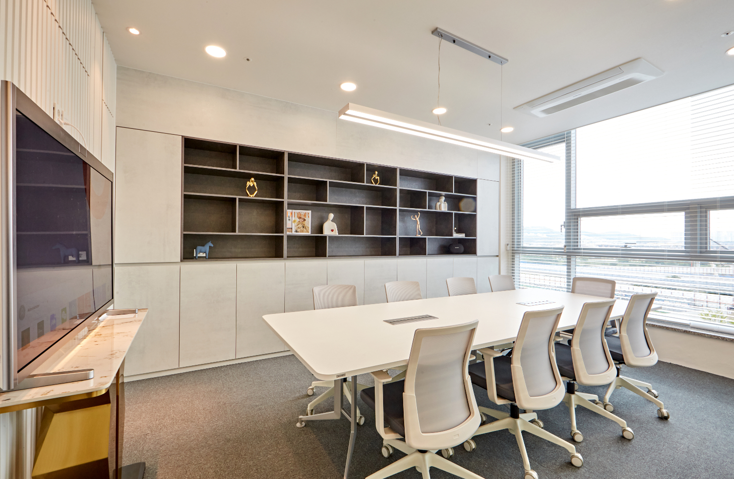 회의실은 바깥에서 보았을 때 통창으로 개방감을 주지만 프라이빗한 회의를 진행할 때에는 시야를 가리기 위해 블라인드를 함께 시공하였습니다. 그리고 내부에는 중앙 테이블 너머에 수납장이 빌트인 되어 있으며 진열대도 함께 있어 고급스러운 분위기를 연출하는데요.