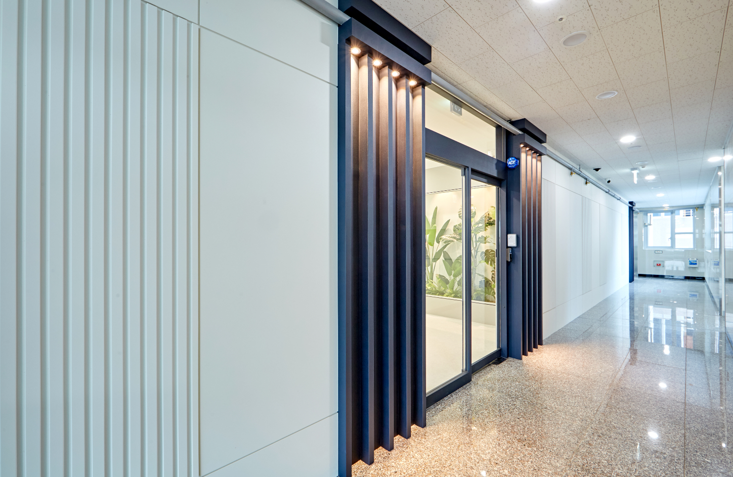 언제나 그렇듯 외관부터 살펴보겠습니다. 파주사무실인테리어의 첫인상은 네이비와 화이트 조합이 인상적입니다. 벽면을 템바 보드로 음각 시공을 하여 포인트를 주었고, 네이비 색감은 모던하고 차분하면서도 올드하지 않은 느낌을 주는 트렌디한 색상이기에 더욱 조화가 어울리는 듯 보입니다.