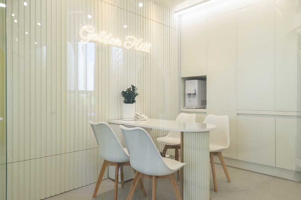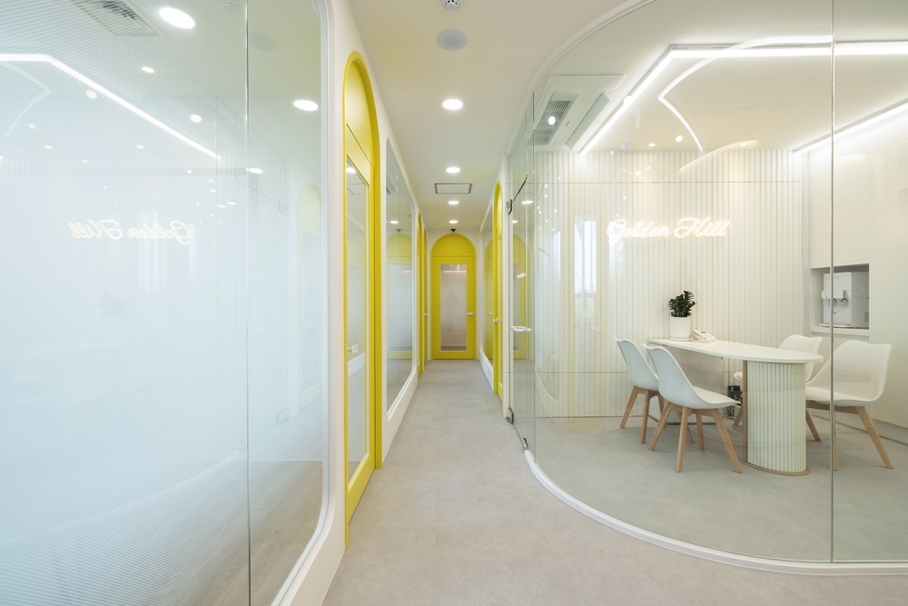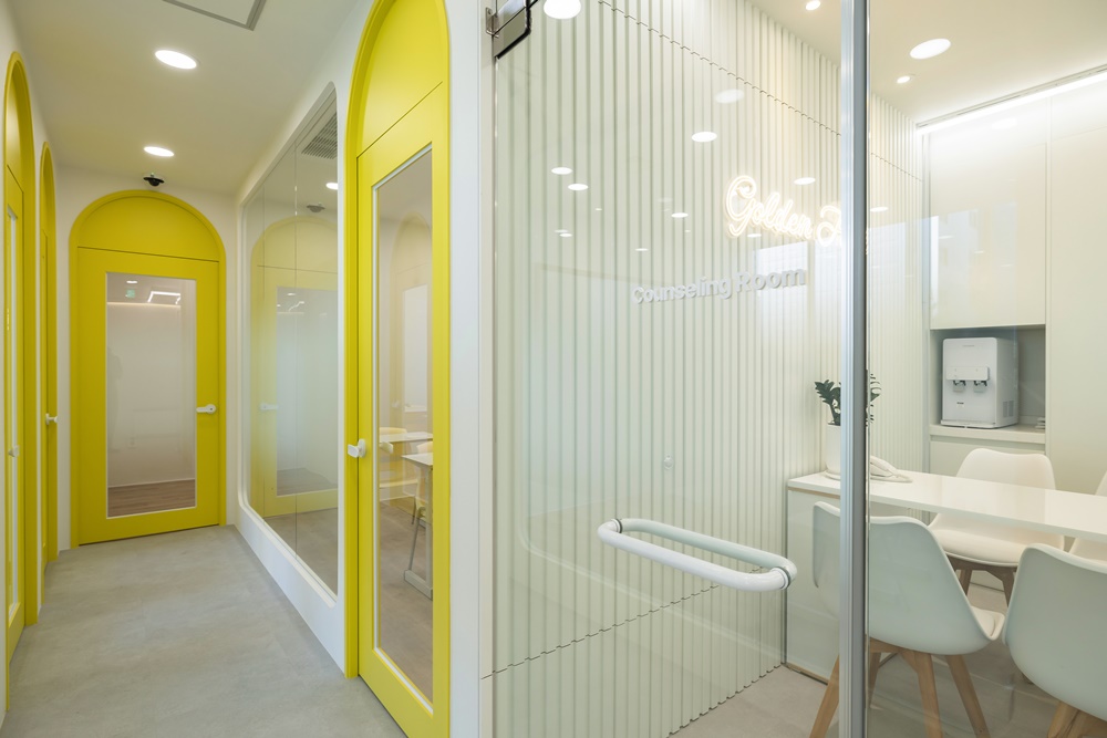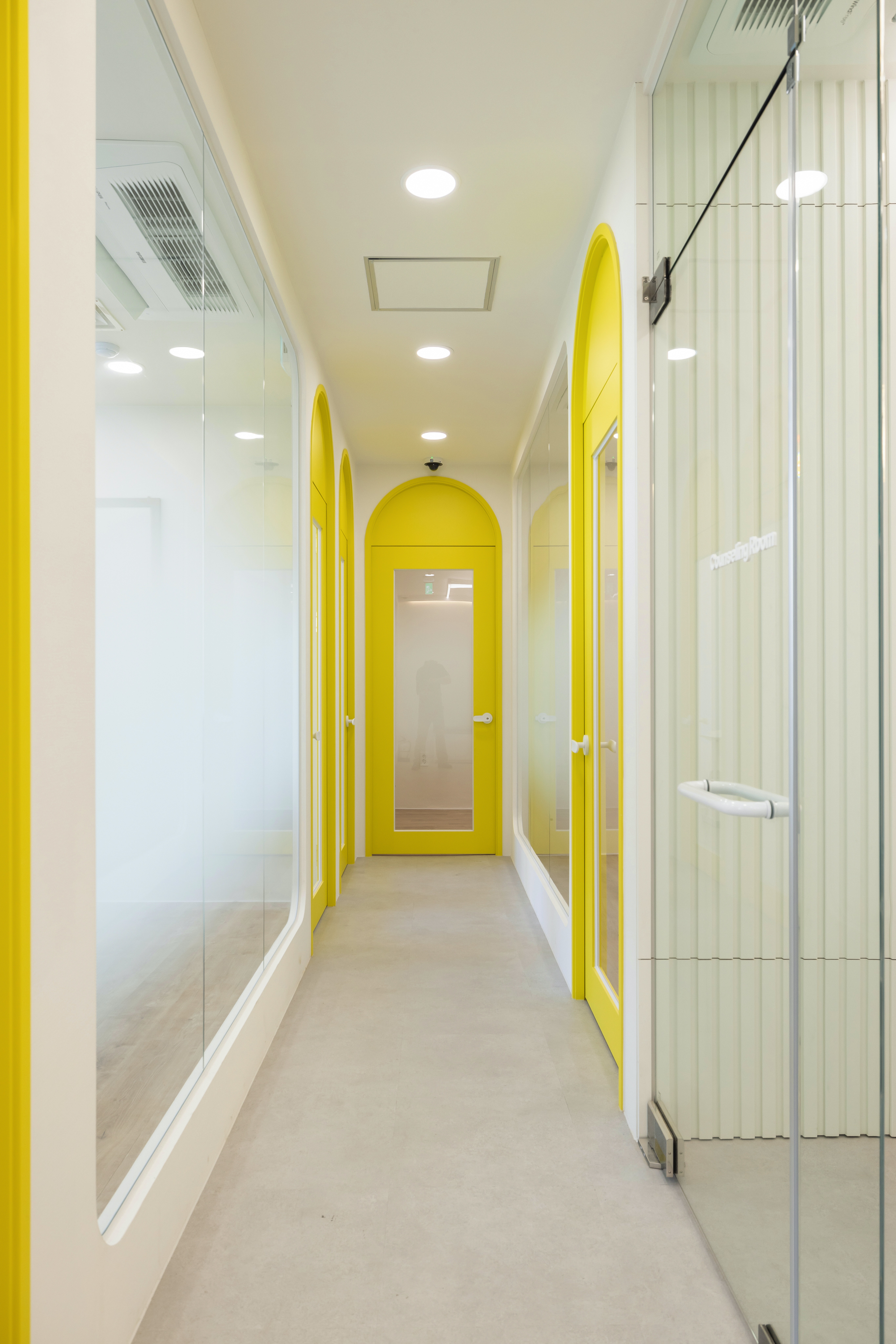 라운드 유리가벽 디자인으로 공간을 분리하면서도 개방감 있게 연출하였고, 노란색 출입문으로 감각을 더한 예쁜 영어 교습소였습니다.