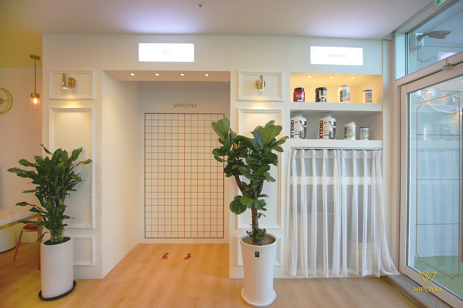요즘은 체중보다는 눈바디라는 말이 있죠. 이 곳에서는 체계적인 눈바디 측정을 위해 공간을 별도로 마련하였으며 벽면에 모눈종이처럼 눈금자를 새겨두었습니다. 그리고 곳곳에 벽등은 물론 화분을 배치하여 플랜테리어적인 면모도 놓치지 않았습니다.