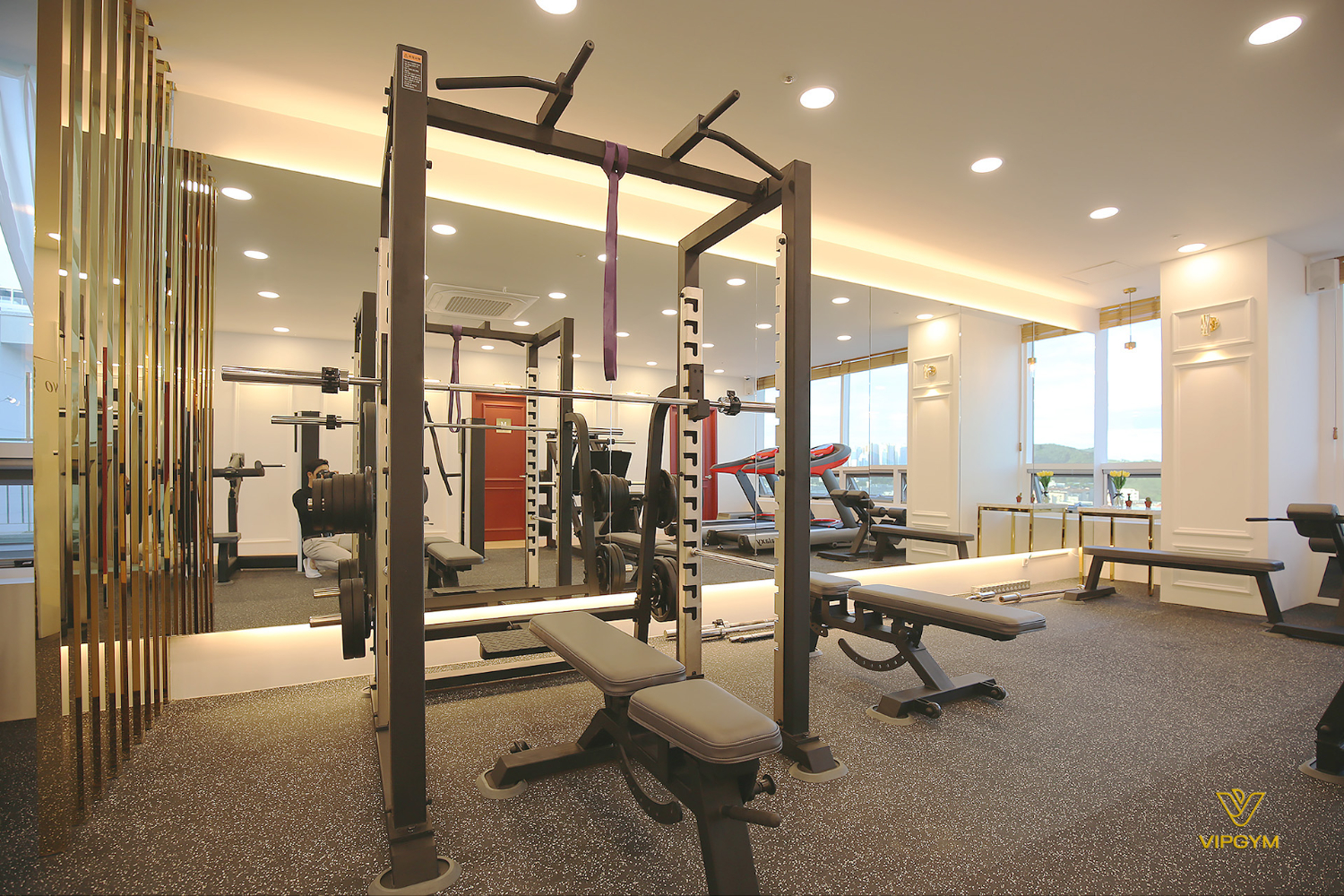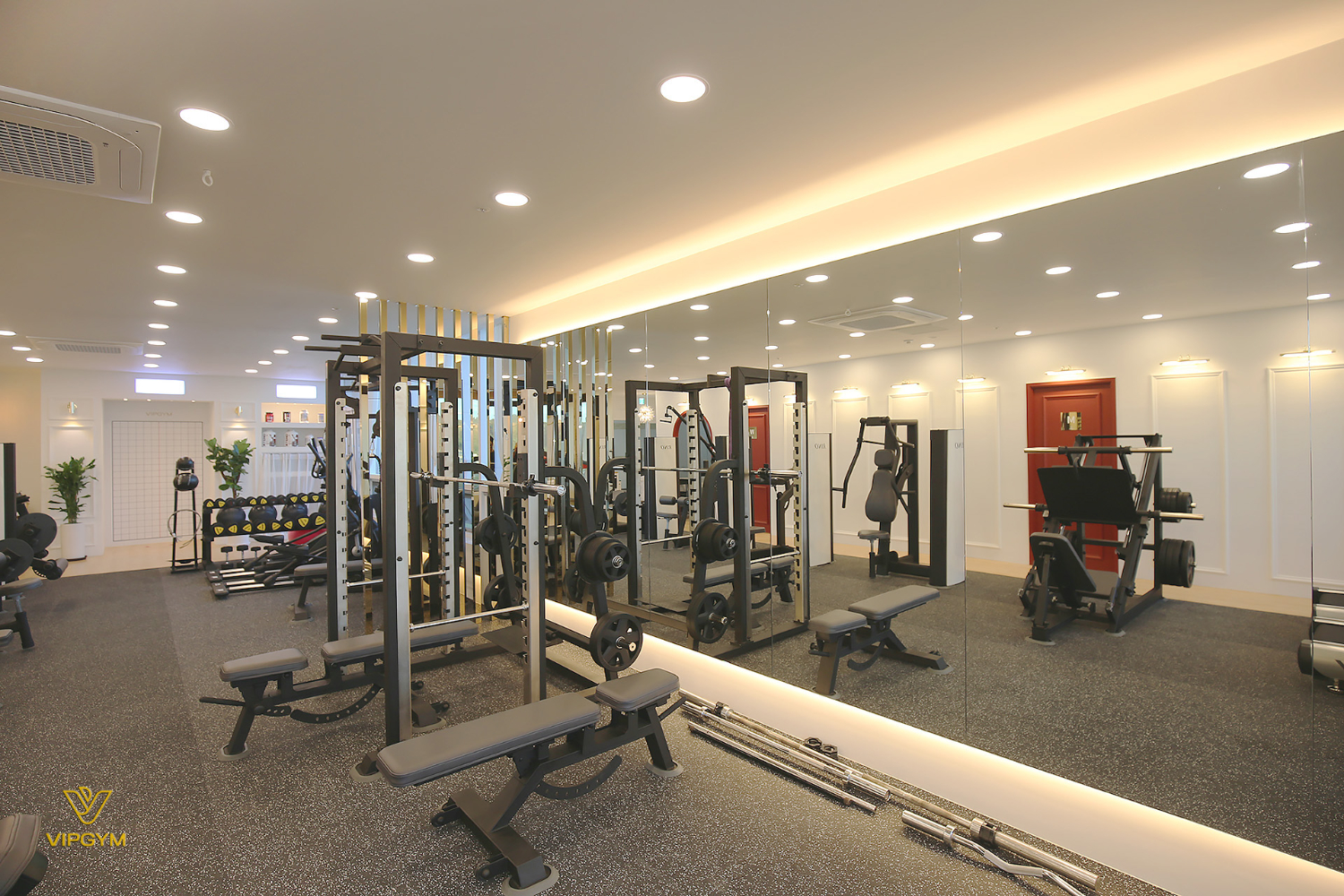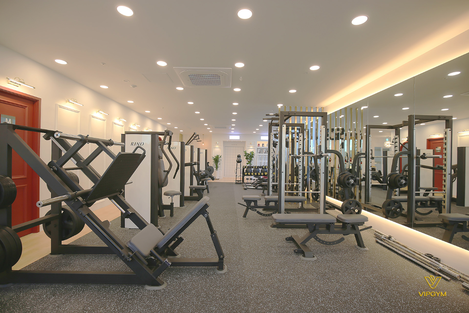 또한 한 쪽에는 전면 거울을 설치하여 자신의 모습을 끊임없이 체크할 수 있도록 하였는데요. 위아래에는 조명을 매립하였으며, 천장에도 주조명 없이 간접조명으로 촘촘히 설치하여 따뜻한 느낌을 더했습니다. 요즘엔느 바디프로필 준비를 위해 1:1 피티를 받으시는 분들이 많은데요. 수치보다는 눈으로 자신을 살피며 부족한 부분을 보완하는 경우가 많기에 거울은 필수적입니다.
