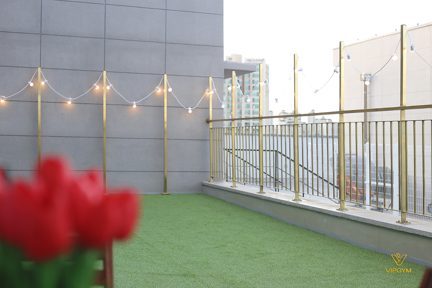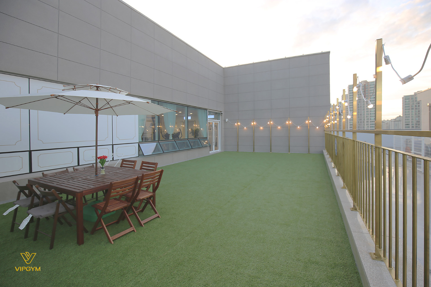 파주 운정 상가인테리어 피티샵의 히든 스팟은 바로 야외 테라스입니다. 운동을 하다가 잠깐 바람이 쐬고 싶거나 휴식을 즐기고 싶을때 나와볼 수 있는데요. 골드 기둥에 전구를 설치하여 밤에도 감성적으로 이용할 수 있게 하였고 인조 잔디와 테이블 및 의자를 설치하여 아늑한 휴식 공간을 만들었습니다.