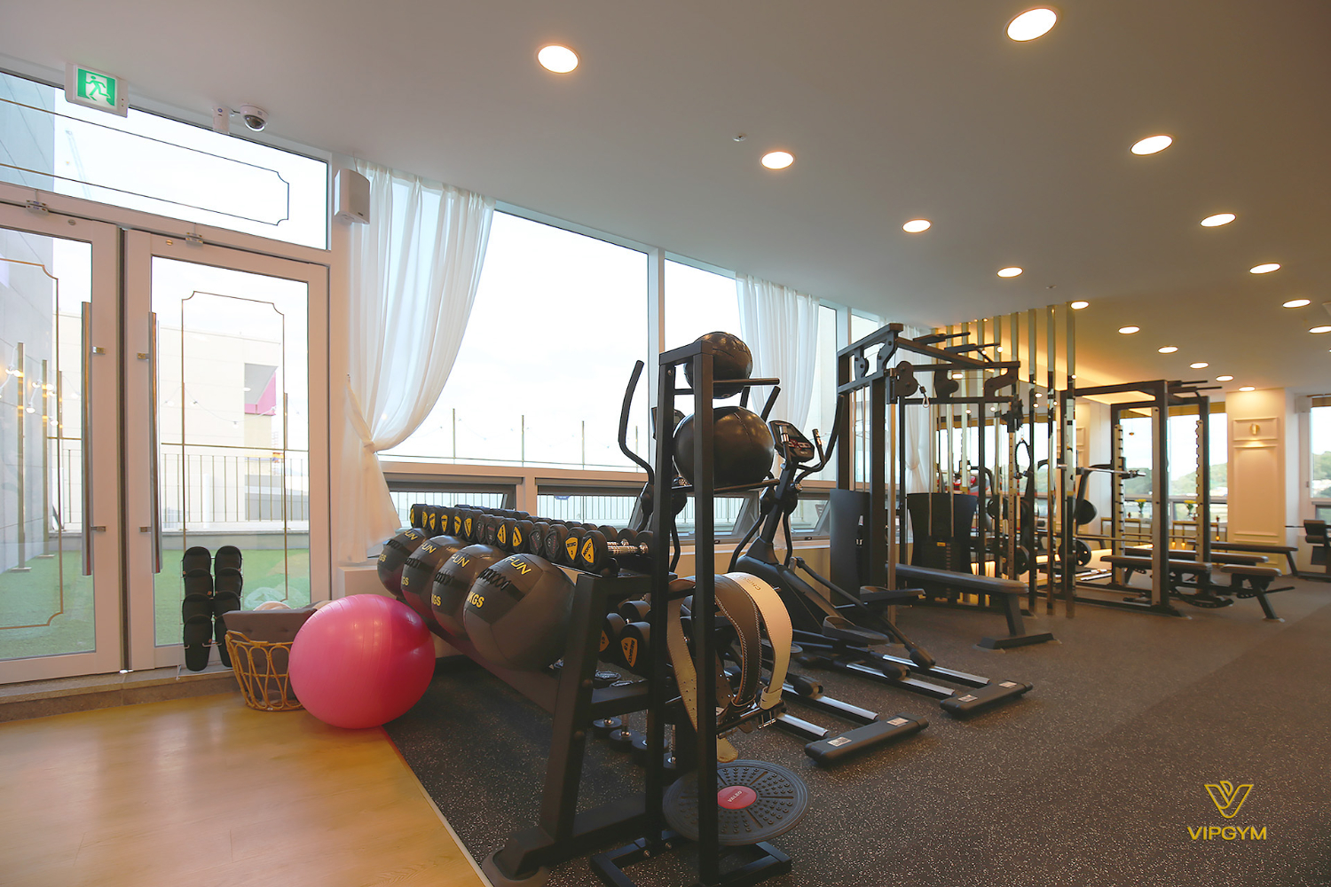 또한 파주 운정 상가인테리어 피티샵의 매력은 야외 공간이 있다는 점인데요. 그래서 전체 통창을 사용하였고, 운동을 하면서도 시야가 막히지 않아 답답한 느낌이 들지 않습니다. 보통 헬스장에 들어서면 안전을 위해 탄성매트를 시공하는 곳이 많은데, 회색의 바닥이 답답하게 느껴지는 경우들이 있지만 이 곳은 다릅니다.