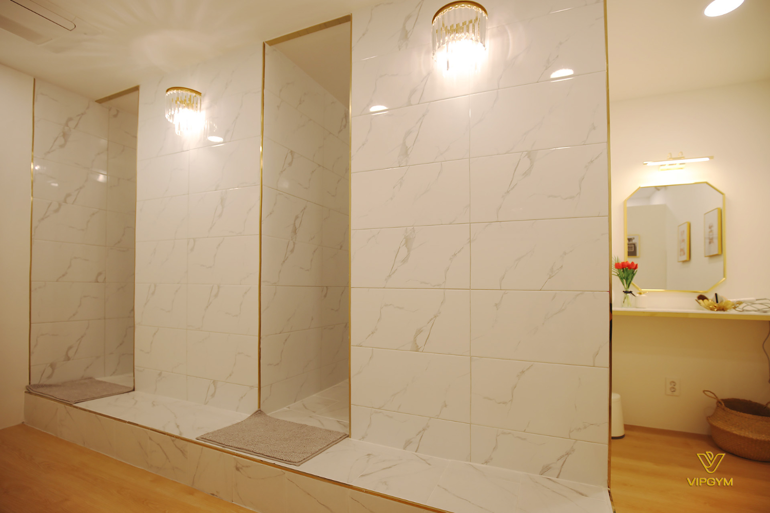 탈의실과 샤워실 공간입니다. 드레스업을 할 수 있는 간단한 화장대가 마련되어 있으며 골드 프레임의 팔각거울을 배치하였습니다. 그리고 거울 상단에는 조명으로 아늑한 공간을 연출해주었는데요. 샤워실의 경우 단차를 두어 공간을 분리하였습니다.