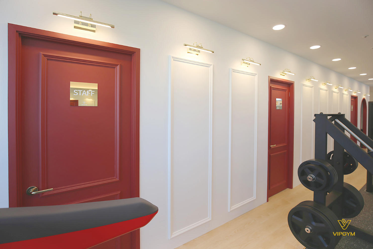 이번 파주 운정 상가인테리어 피티샵의 공간 포인트 컬러는 레드입니다. 곳곳에 다른 공간으로 들어가는 도어를 전부 채도가 낮은 레드 컬러로 도장하였는데요. 다른 공간과의 연결 포인트를 확실하게 해두었으며 그에 따라 전부 조명을 매립한만큼 화사하게 연출이 가능합니다.
