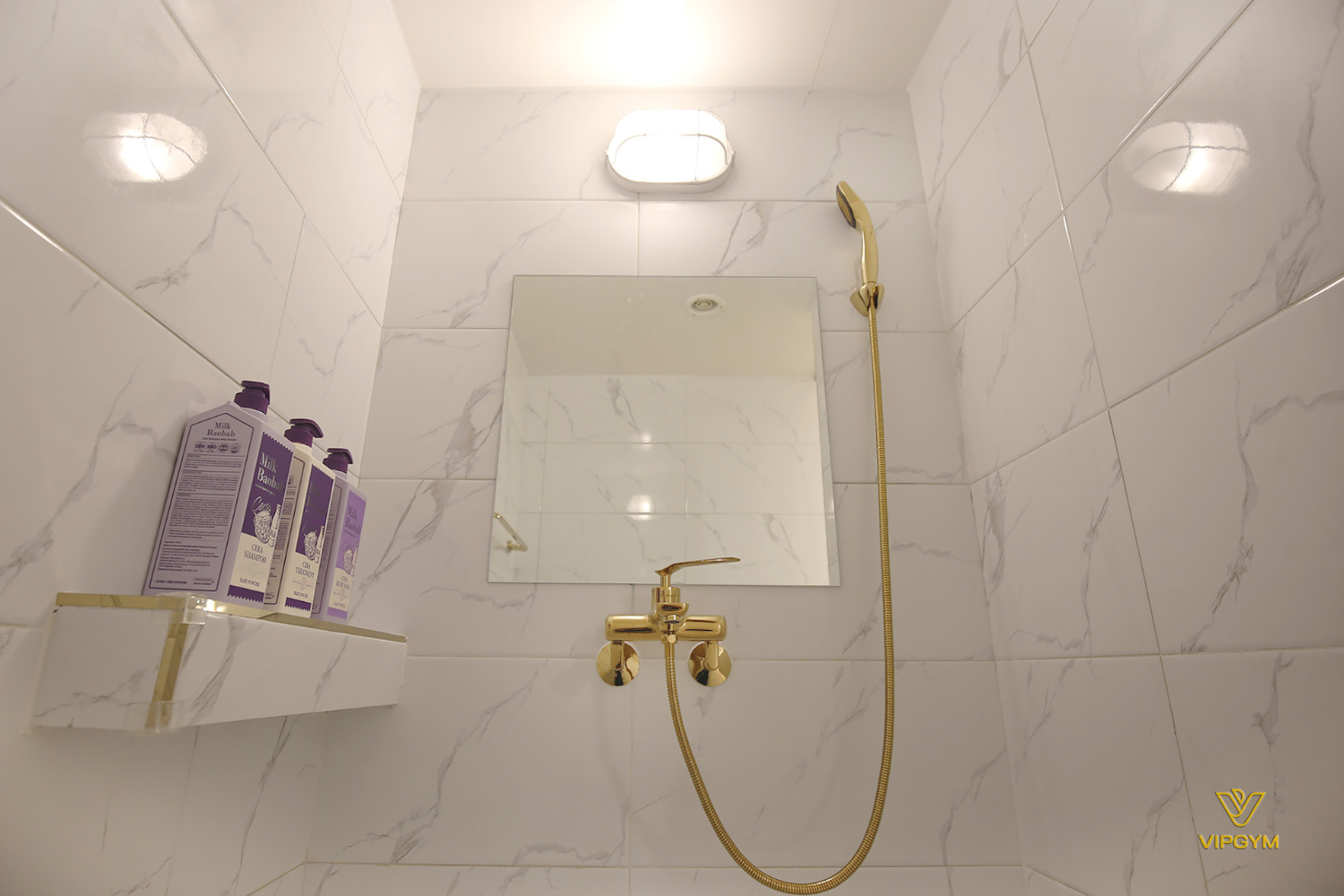 샤워실의 내부 역시 대리석과 골드의 조합입니다. 심플하면서도 럭셔리하고 필요한만큼만 공간을 활용하였기 때문에 소형 인테리어에서도 충분히 가능합니다. 그리고 벽선반을 시공하여 아이템들을 올려둘 수 있게 비치하는 센스도 있지 않았습니다.