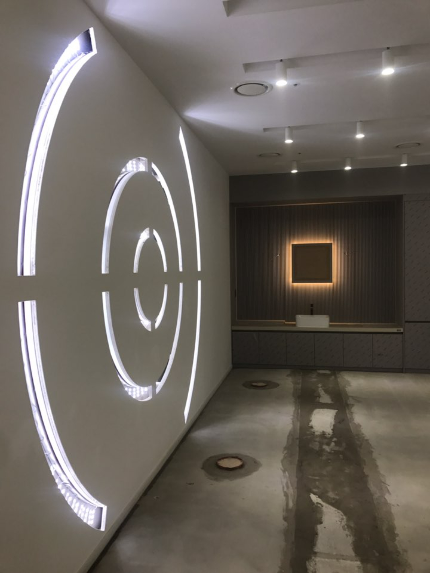 쇼룸으로 사용 될 이곳은 레이저옵텍의 기술들을 선보이고, 보유하고 있는 기기들을 전시하여서 방문객들에게 소개해드리는 공간으로 활용될 예정인데요. 정면에는 연그레이톤의 키큰장과 하부장을 설치하여서 수납공간을 마련하였으며 위생을 위한 싱크볼을 설치했습니다. 그리고 템바보드로 시공하여서 클래식한 연출을 도왔으며 사각거울의 뒷편에도 조명을 잊지 않았는데요. 왼쪽의 벽에는 밋밋하지 않도록 조금은 기하학적인 문양으로 조명을 매립하였습니다. 혹자는 아이언맨이 생각난다고도하고 혹은 고차원으로 통하는 비밀의 문같은 느낌이 난다고도 하더군요.