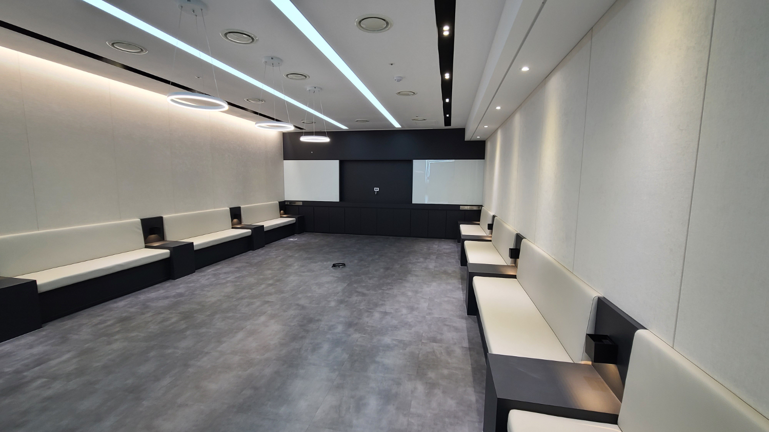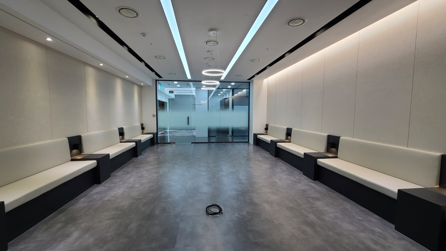 대회의실로 쓰일 컨퍼런스 룸에는 중앙에 링모양의 팬던트 조명으로 포인트를 주었으며 양옆으로 살짝 푸른색이 도는 라인 조명을 설치하였는데요. 이는 입구의 블랙로고 후면에 부착되어 있던 조명 컬러와 통일감을 준 포인트라고 할 수 있습니다. 그리고 뒷편에는 블랙 도장으로 깔끔하게 마무리 된 수납공간과 화이트보드가 부착되어있으며 양쪽에는 회의 참석을 위한 벤치가 나열되어있습니다. 또한 사이 사이에 테이블과 벽등으로 공간의 멋을 더해주고있는데요. 이번 파주 일산 고양 사무실인테리어는 독특하면서도 해당 회사의 정체성을 살리고, 공간만 구경하여도 브랜드 가치에 대한 이해를 도울 수 있는 디자인이라고 할 수 있습니다.