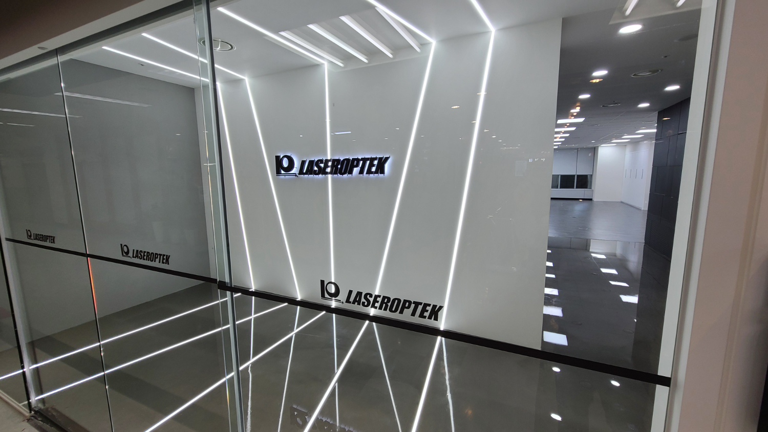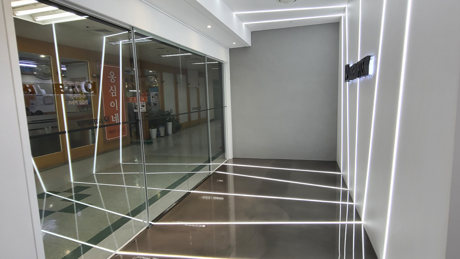 그렇게 입구도어를 살펴보면 불규칙적이게 설치되어있는 라인 조명이 마치 미래로 떠다는 입구인듯한 느낌을 줍니다. 다른 곳에서 만나보지 못한 독특한 파사드에 클라이언트분이 박수를 치며 감탄하셨는데요. 천장에서부터 아트월과 바닥까지 이어지는 라인 조명은 불규칙적이게 서로 엉키면서도 얇고 세련된 라인이 멋스러움을 자아내고 있습니다. 또한 화이트 벽과 대비되는 블랙 로고를 양각으로 새겨 넣으면서 더욱 눈에 띄는 효과라고 할 수 있는데요. 전체 유리도어로 진행하였기에 외부에서도 한 눈에 알아볼 수 있으며 모두가 한 번쯤은 돌아볼만한 디자인입니다.