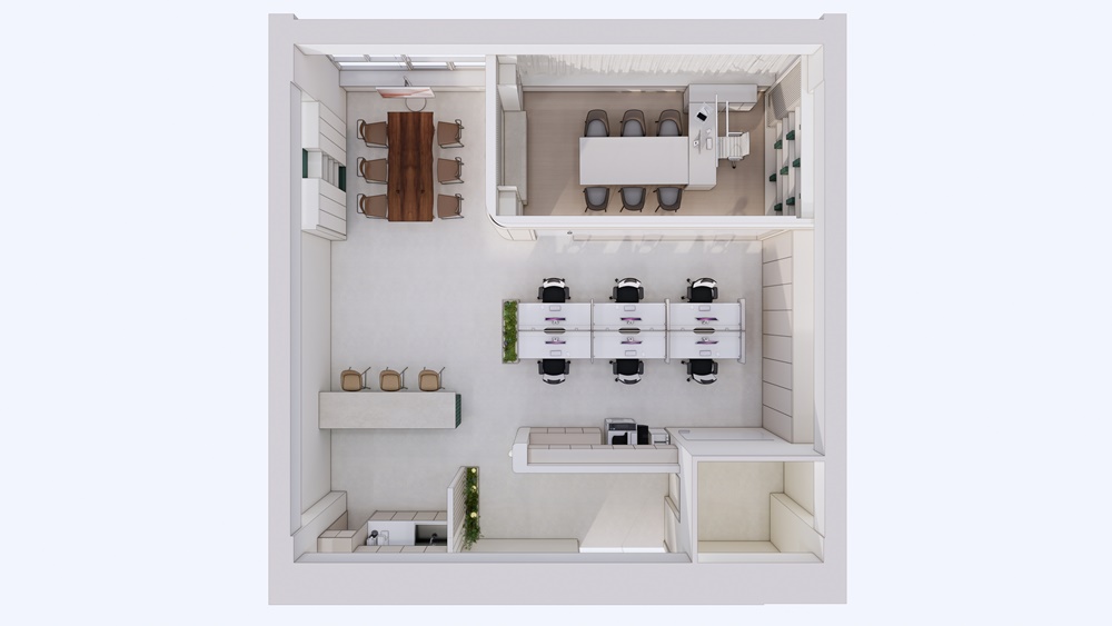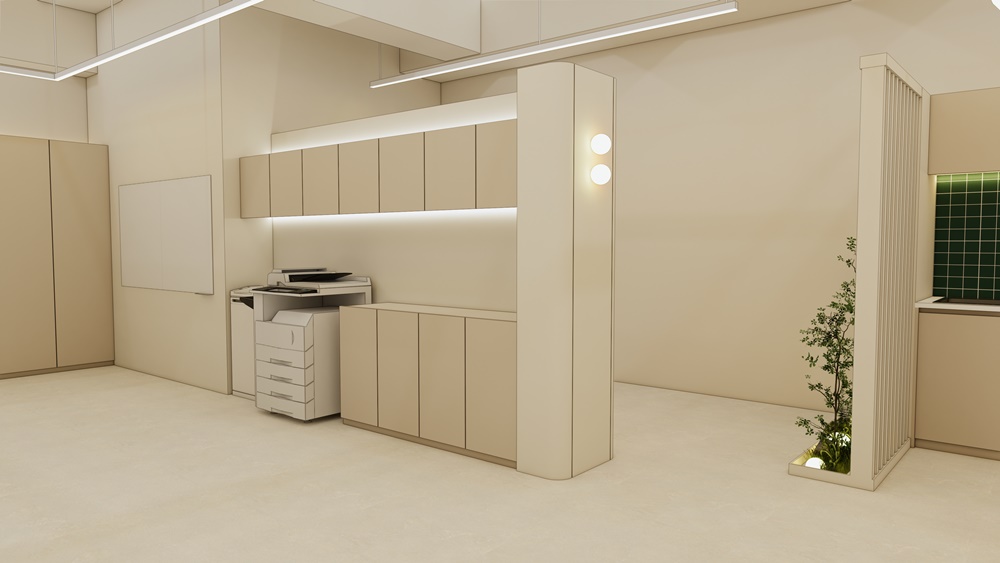 수납공간은 벽면이나 천장에 선반이나 수납장을 설치하여 물건들을 깔끔하게 정리할 수 있으며, 프린터, 복사기, 팩스 등의 사무용품은 일정한 장소에 배치하여 동선을 줄이고 업무 효율성을 높일 수 있습니다.