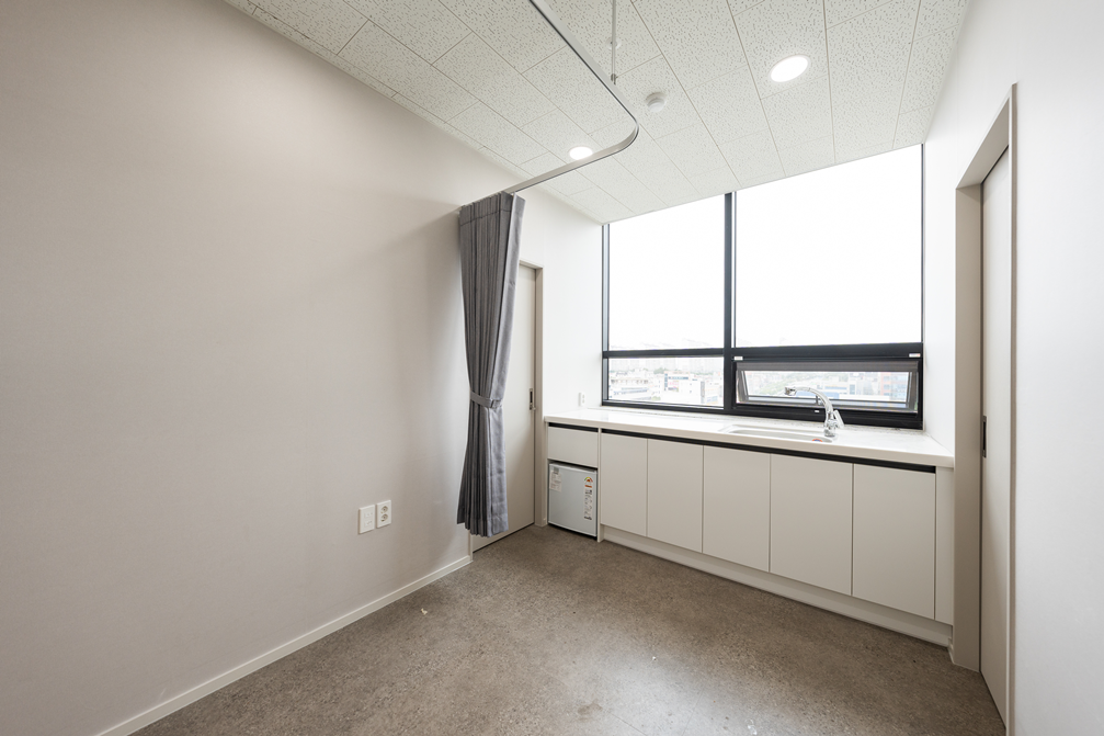 환자들이 장시간 근무하는 내부 생활 공간은 색감 및 조명, 동선이 핵심입니다. 벽과 가구에는 부드러운 톤을 적용하고, 자연스러운 동선을 확보하여 이동이 편리하도록 설계하였습니다. 또한 조명은 눈부심 없는 간접조명을 중심으로 배치해 낮과 밤 모두 쾌적하게 사용할 수 있도록 한 것이 특징입니다.