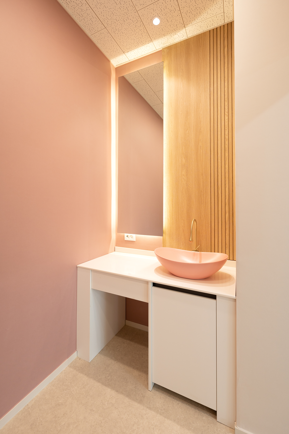 부드러운 핑크 계열의 색상을 사용하여 사랑스러운 분위기를 조성하였고, 포인트 조명을 배치하여 세면과 화장 시 편안함을 제공하였습니다. 이러한 작은 공간 하나하나까지 세심하게 설계함으로써, 요양원 전체가 편안한 안식처처럼 느껴지도록 만들었습니다.