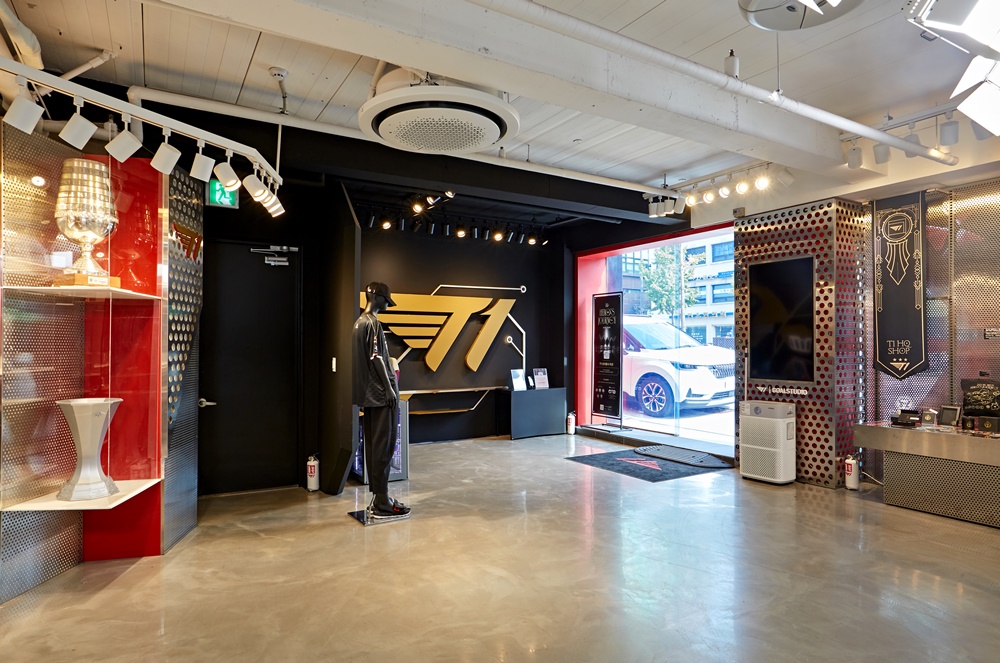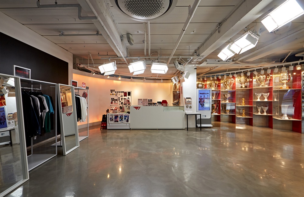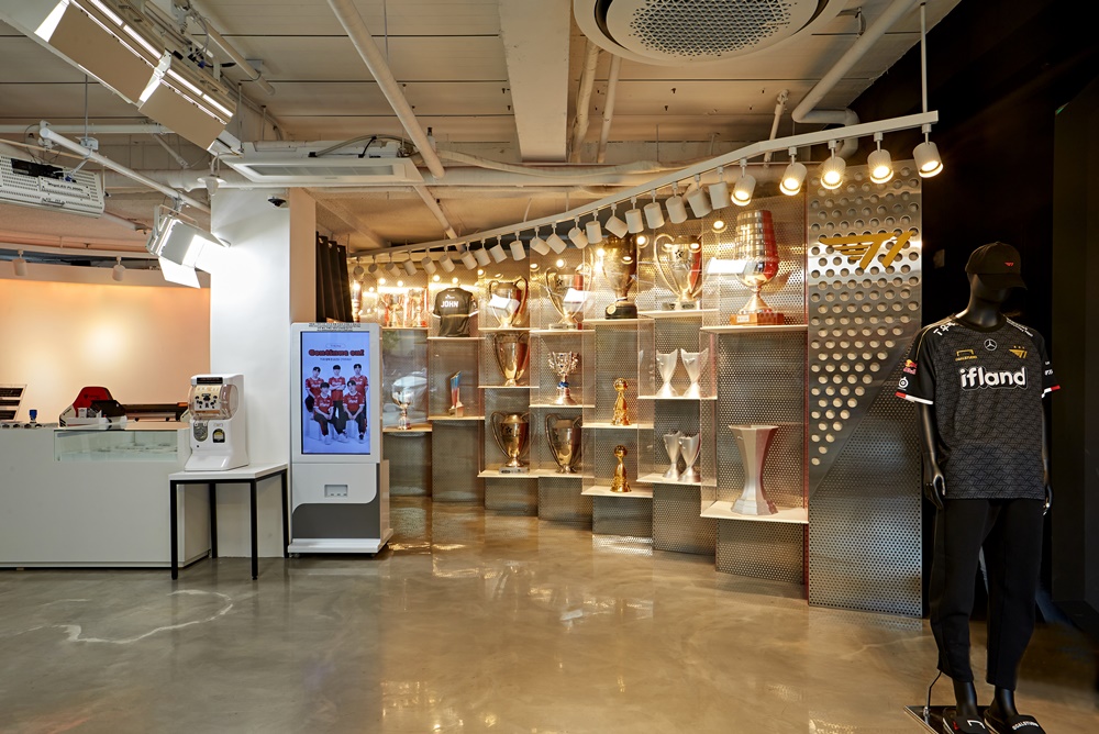 먼저 공간 전반을 살펴보면 벽면 한쪽에는 대형 브랜드 로고가 설치되어 방문객이 매장에 들어서는 순간 브랜드 정체성을 직관적으로 인지할 수 있도록 했죠.