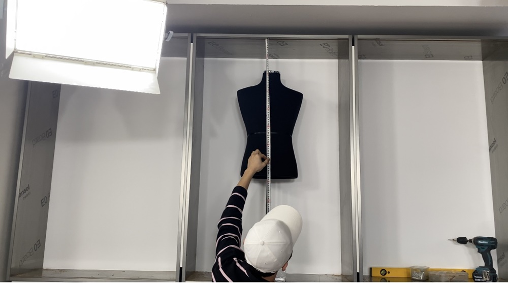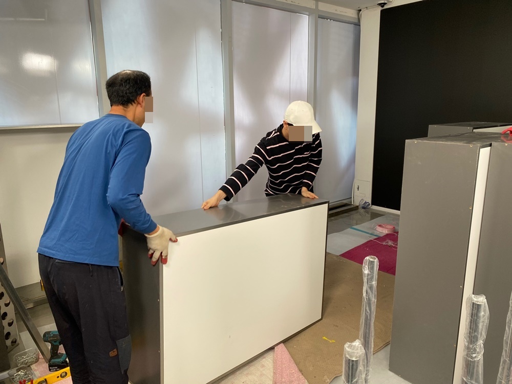 먼저 중앙 디스플레이와 서브 진열대 설치부터 시작했으며 모든 가구와 진열대는 3D 설계에서 제시한 정확한 위치와 높이, 각도를 고려하여 배치했어요.
