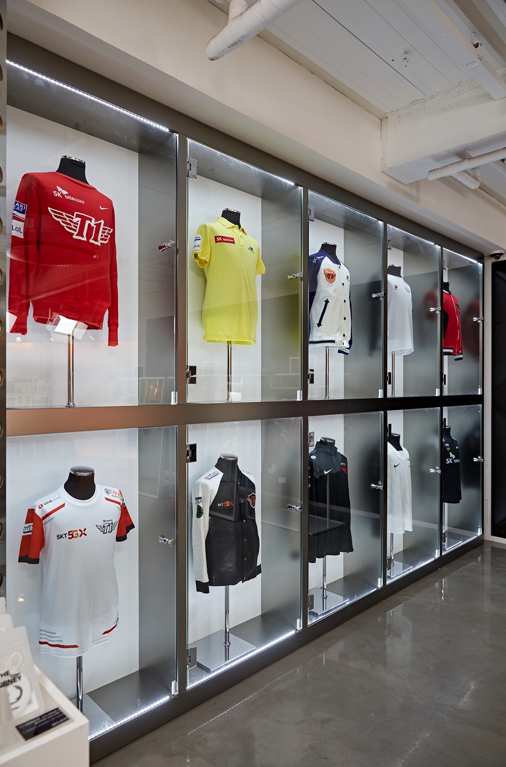 전체적으로 미니멀하고 간결한 디자인으로 제품에 시선을 집중시키면서도 깔끔한 공간감을 제공했고 투명 유리 진열대와 벽면 조명을 적절하게 배치하여 제품 특징을 강조시키며 공간에 깊이감을 더했죠.