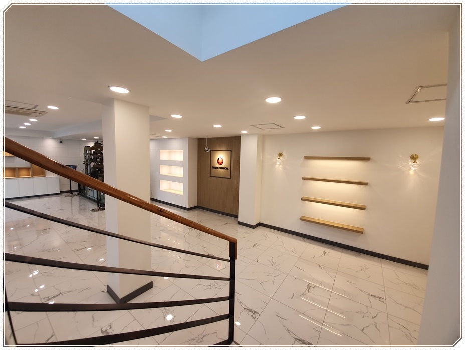 윗층 사무실로 올라가는 계단 공간입니다. 계단과 계단 사이 공간의 벽면에도 매립형 선반을 시공해 제품을 진열할 수 있도록 해드렸습니다. 각 선반마다 조명을 시공해 제품을 강조하면서 은은한 분위기를 연출할 수 있도록 함으로써 각 공간을 홍보 및 마케팅 수단이 되도록 해드렸죠.
