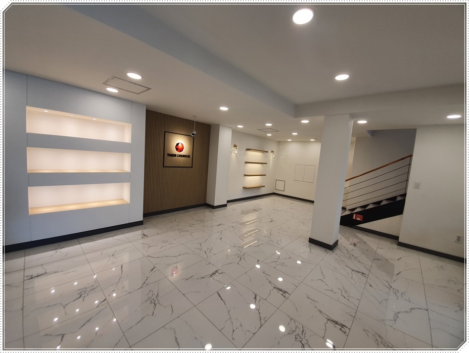 입구로 들어왔을 때 보이는 정면 벽면에는 우드 템바보드 아트월을 시공해 고급스러운 분위기를 조성했고 업체명과 로고를 설치해 포인트를 줬으며 서포트 조명을 시공해 시인성을 높였습니다. 아트월을 중심으로 양측에는 매립형 선반장과 벽면 선반을 시공하고 조명을 설치해 은은한 분위기의 갤러리 느낌이 나도록 했습니다.