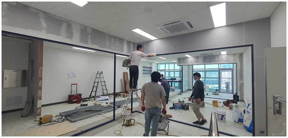 오늘은 평택 스마트큐브 사무실인테리어 공간분리를 위한 아이디어를 소개해드리려고 합니다. 신축 건물이 아닌 이상 인테리어의 첫 시작은 철거라고 할 수 있는데요, 문, 샷시, 타일, 말 등을 뜯어내는 과정에서 소음과 분진이 많이 발생하므로 복도, 엘리베이터, 지하주차장 등에 보양 작업을 미리 해야합니다.