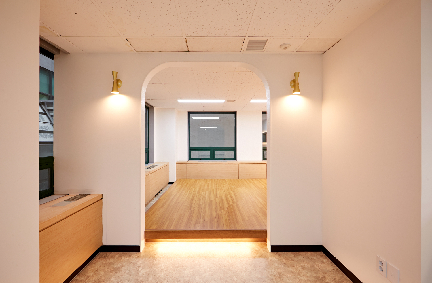 그 옆에 마련된 휴게 공간에는 좌식으로 사용할 수 있도록 원목 마루 상판이 마련되어 있는데요. 입구를 아치형으로 만들어 부드러운 느낌을 강조하고 있으며 곳곳에 마련된 콘센트는 더욱 높은 질의 휴식을 제공합니다. 그리고 이처럼 적절한 휴게 공간을 마련해둔다면 직원들의 사기는 높아지고 안락한 워라밸에 회사에 대한 만족도도 높아질 수 밖에 없는데요.