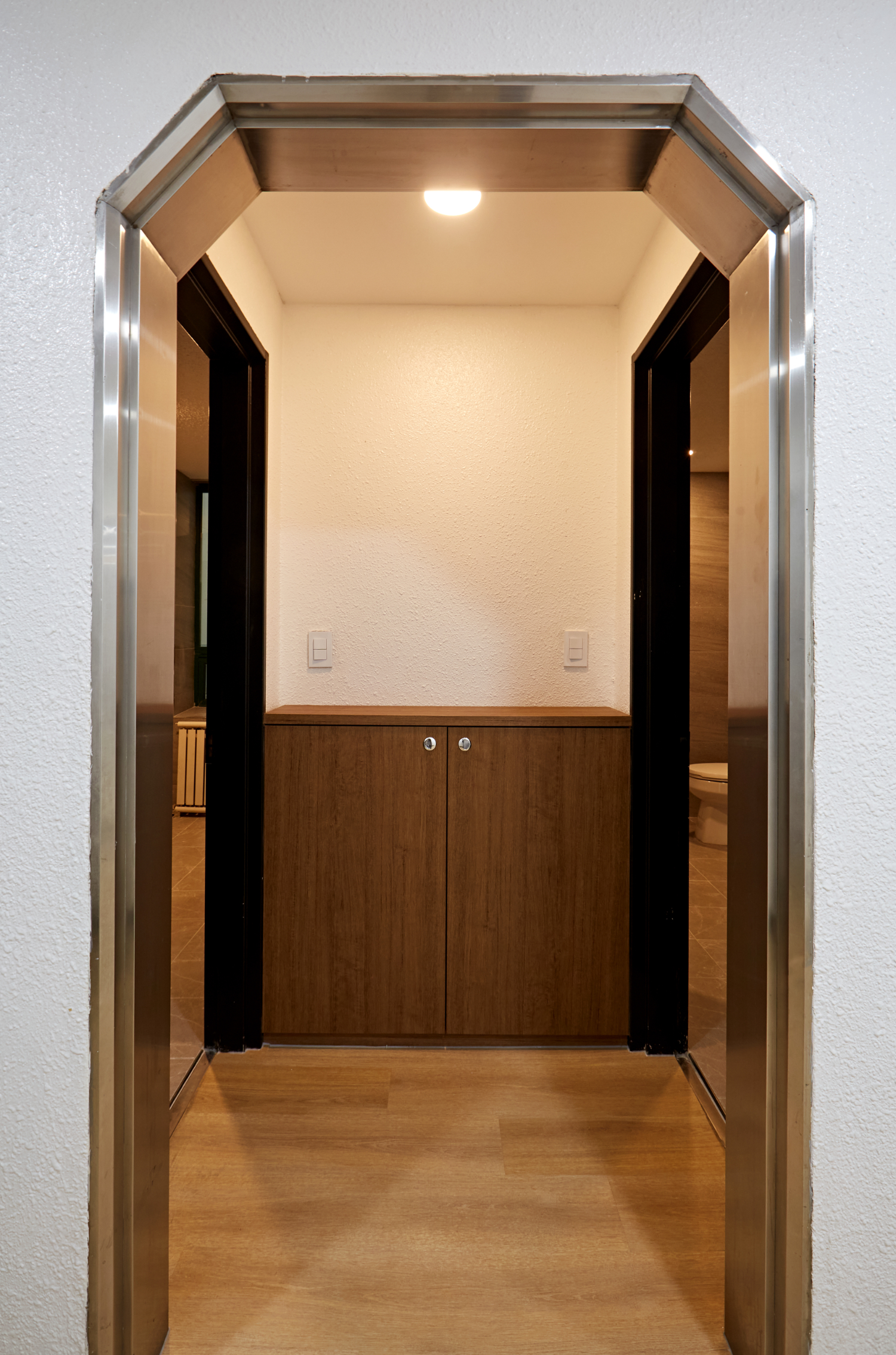 들어서자마자 보이는 로비공간은 나중엔 간단한 대기석 및 휴게공간으로 쓰여질 예정인데요. 커다란 테이블이 들어설 예정이며 오른쪽에는 빌트인 키큰장이 넓은 수납력을 자랑하고 있으며 바닥의 원목과 정면에 보이는 원목 파사드가 통일감을 이뤄주고 있습니다. 또한 3D 제안과 다르게 바닥을 화이트 대리석 질감으로 시공하여서 더욱 넓어보이는 효과를 높였습니다.