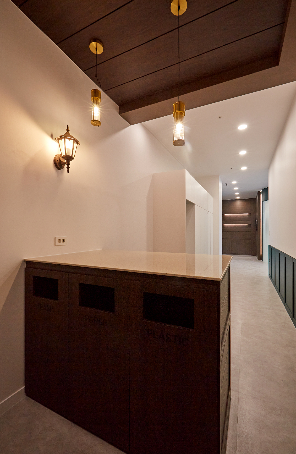 빈티지한 프레임이 돋보이는 조명들과 벽등을 활용해서 한층 더 분위기를 살려주고, 아일랜드 식탁의 하부장에는 수납공간과 더불어 분리수거 프레임을 함께 집어넣어 공간 활용도를 높였습니다. 그리고 벽면의 하단에는 그린컬러로 웨인스코팅 시공을 하였습니다. 조명은 주광색으로 사용하여서 따뜻한 분위기를 연출했는데요. 다른 공간들이 대부분 푸른 느낌이라면 이곳만 유독 따뜻한 느낌으로 하여 차별화를 준것이 포인트입니다.