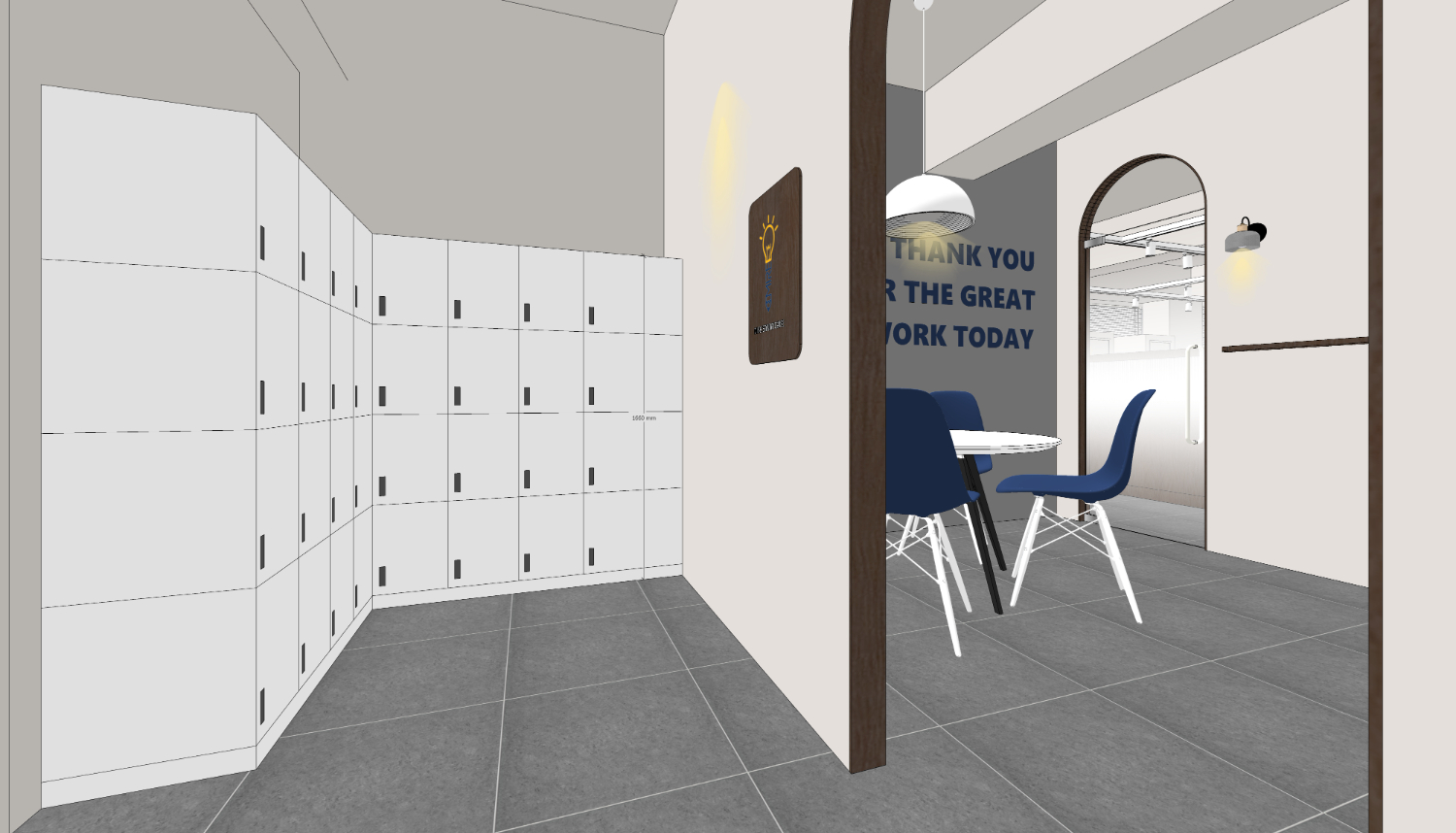 카페테리아 공간의 한 쪽 벽면에는 매트한 그레이로 도장하여 힘을 낼 수 있는 문구를 양각으로 새겨넣었습니다. 세련되면서도 심플한 포인트가 되었고, 천장의 레일 조명은 공간을 더욱 미니멀하게 만들어주었는데요.