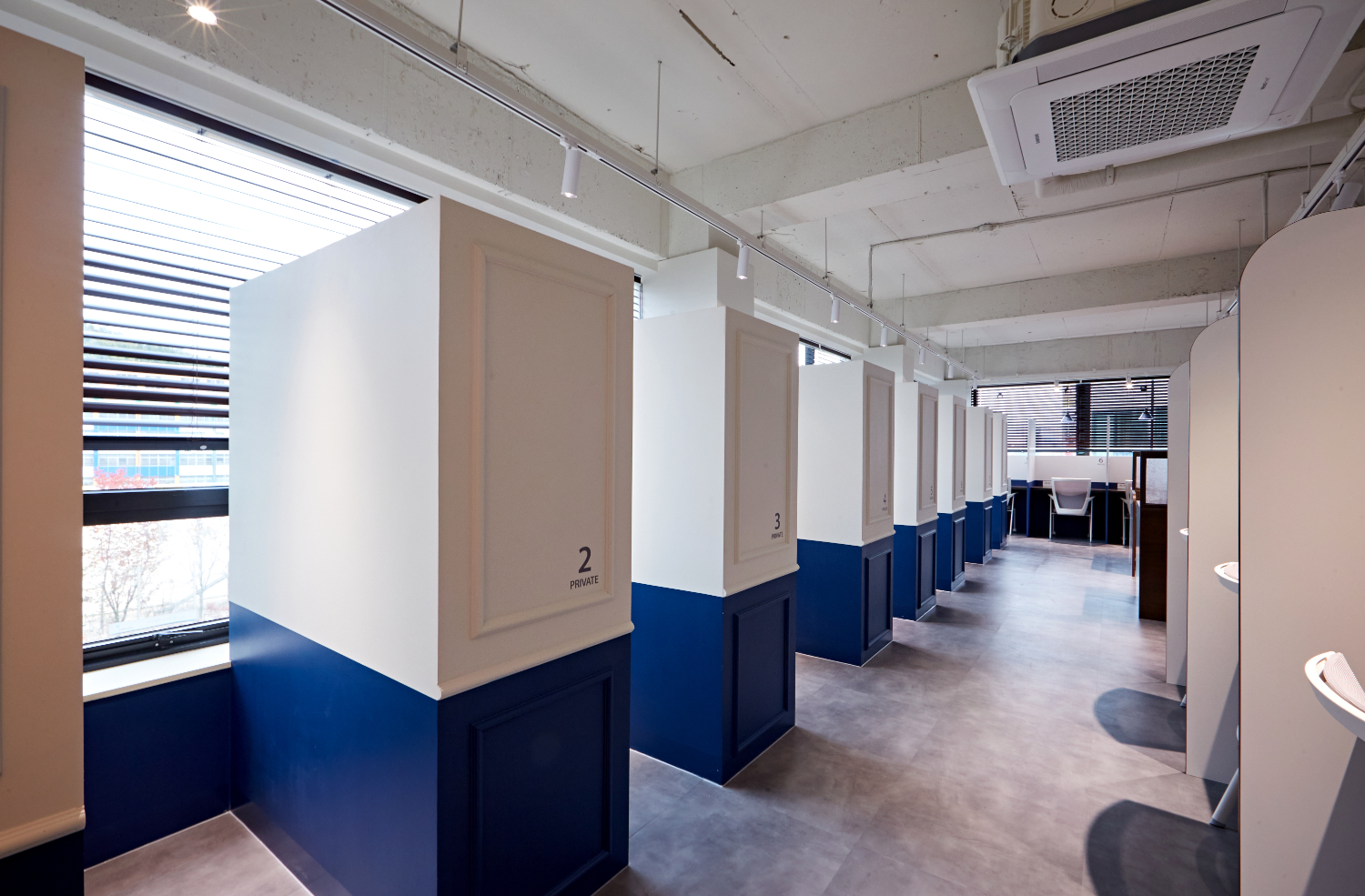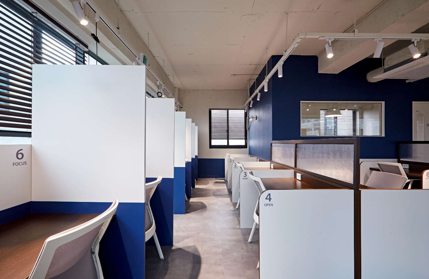 모든 파티션의 높이가 높지 않아서 답답하지 않으면서도 앉아있으면 외부와의 시야를 차단해 집중도를 높일 수 있습니다. 레일 조명을 제안드렸으며 메인 컬러인 네이비와 조화를 이룰 수 있는 그레이, 화이트, 우드재질을 사용하였습니다.
