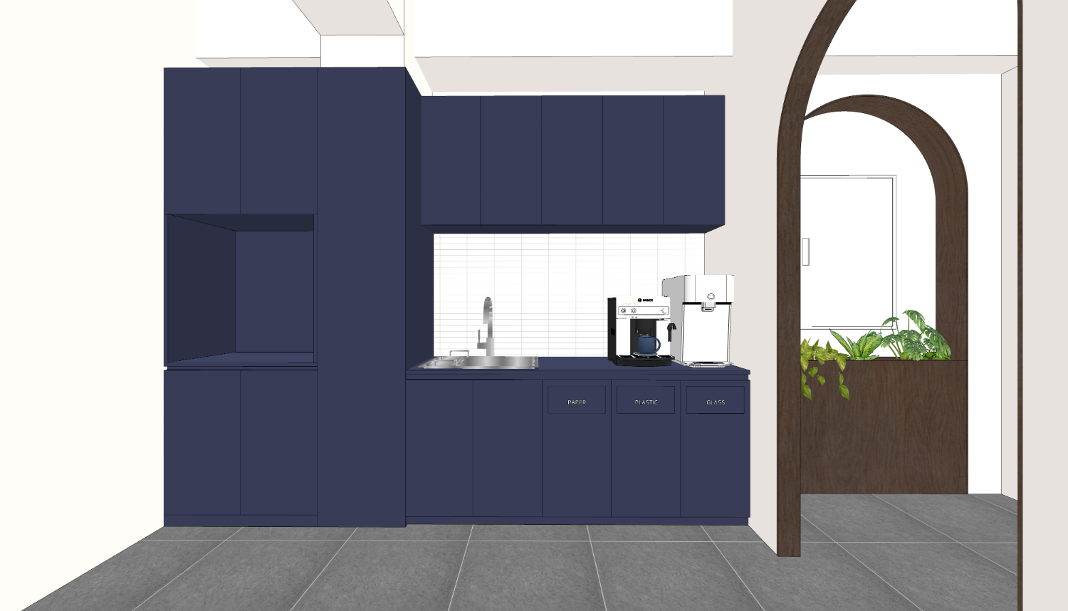 바닥은 시멘트 질감이 느껴지는 그레이 색상으로 시공했습니다. 빌트인 수납장 컬러인 네이비톤과 조화를 이루며 고급스러운 이미지를 느끼게 해주는데요. 간단한 것들을 수납할 수 있고, 세면대와 정수기 그리고 분리배출을 위한 쓰레기통도 매립 되어 있어 실용성이 높은 구조입니다.