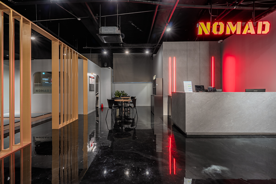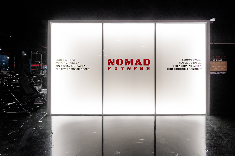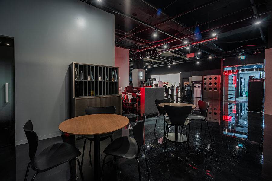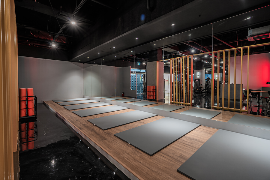 튼튼한 블랙 베이스에 다양한 레드 포인트 장식을 활용하면서 운동 구역, 휴식 공간, 상담 공간 등으로 나누어
