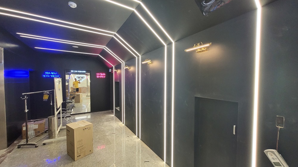 옐로우컬러 벽면에 밝은 LED 조명이나 스포트라이트를 사용하여 선명하고 생생한 느낌을 줄 수 있습니다.