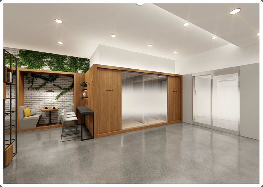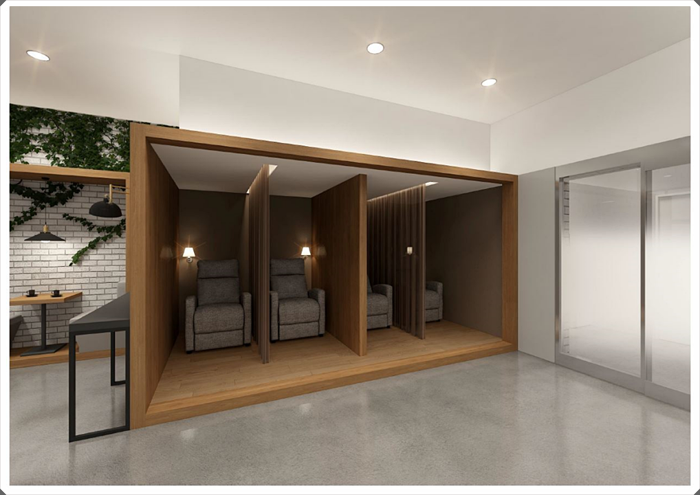 따뜻하고 아늑한 분위기를 조성하는 우드톤으로 디자인한 독립 공간입니다. 개별룸으로 계획하고 안마의자를 두어 누구의 방해도 받지 않고 잠시 쉬면서 릴랙스할 수 있는 공간으로 꾸몄습니다.