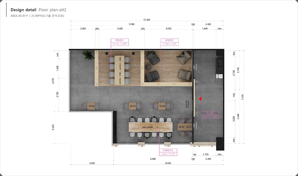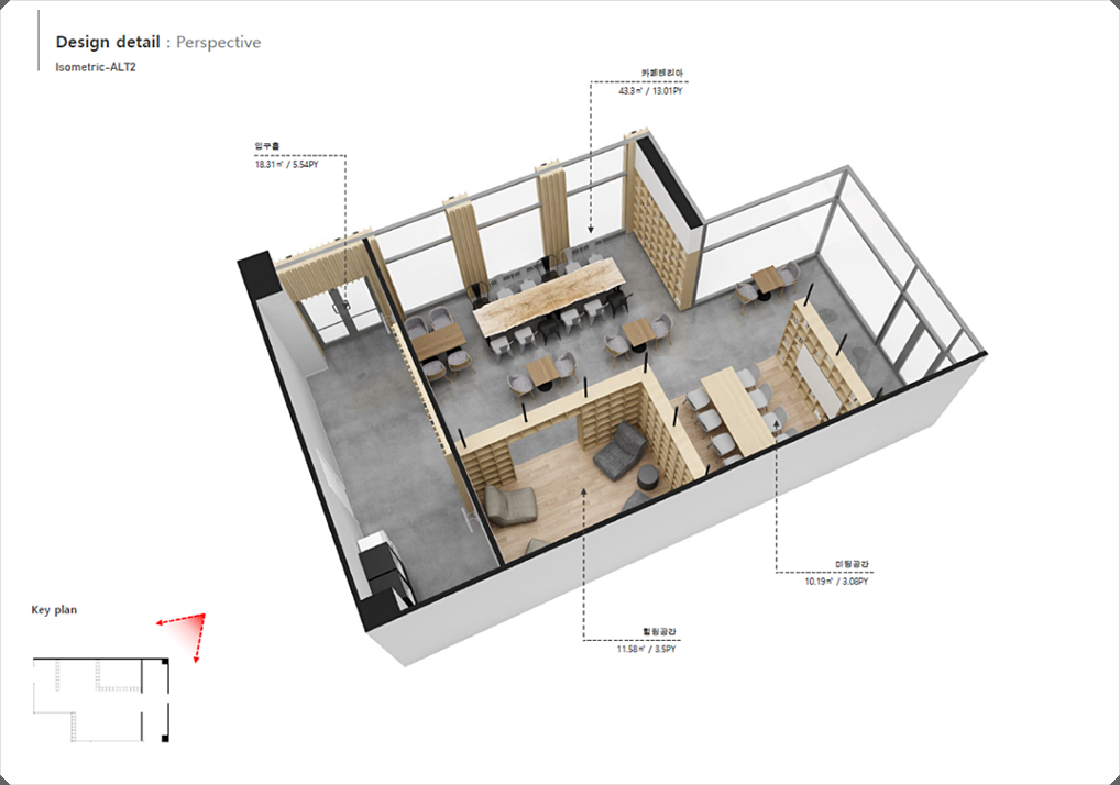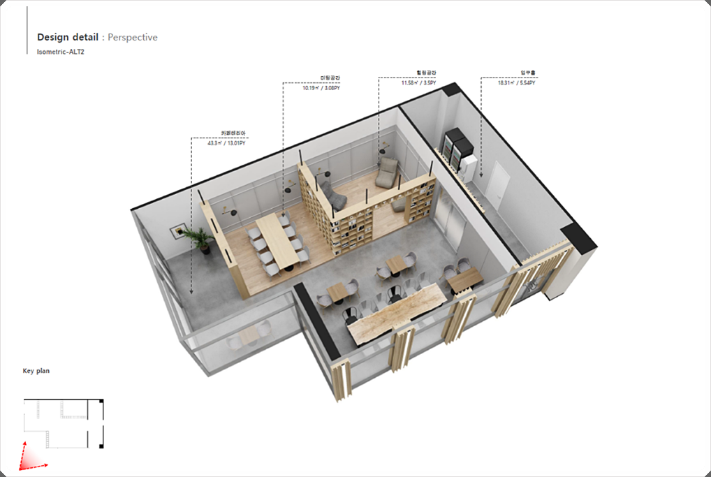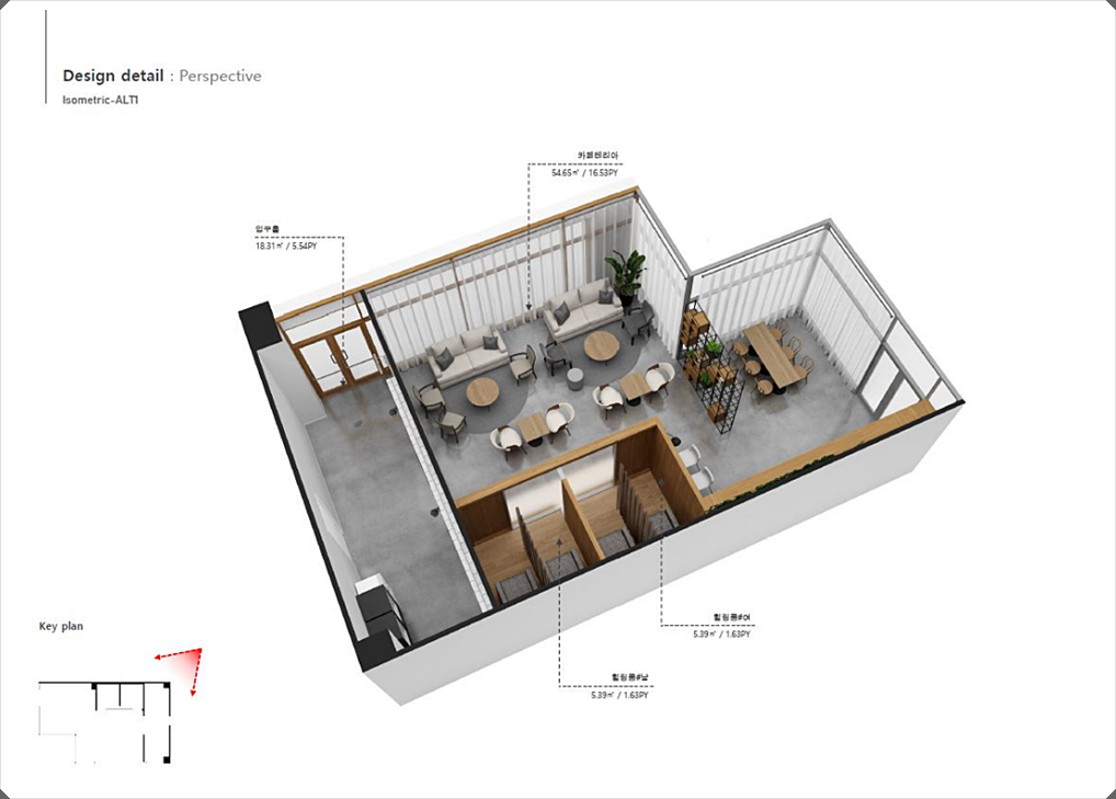 입구공간, 미팅공간, 힐링공간으로 구성했고 전체적으로 우드를 적용해 아늑하고 편안하게 쉬거나 업무를 진행할 수 있도록 계획했습니다.