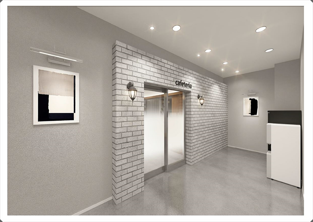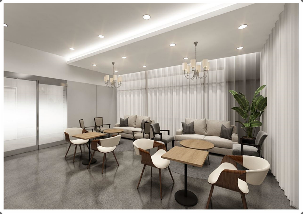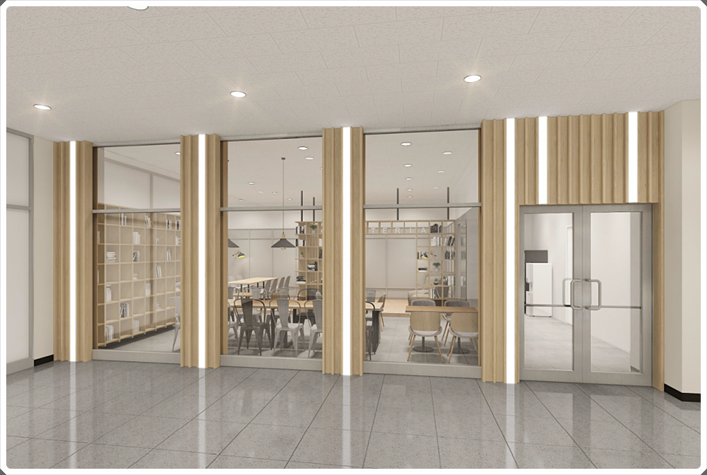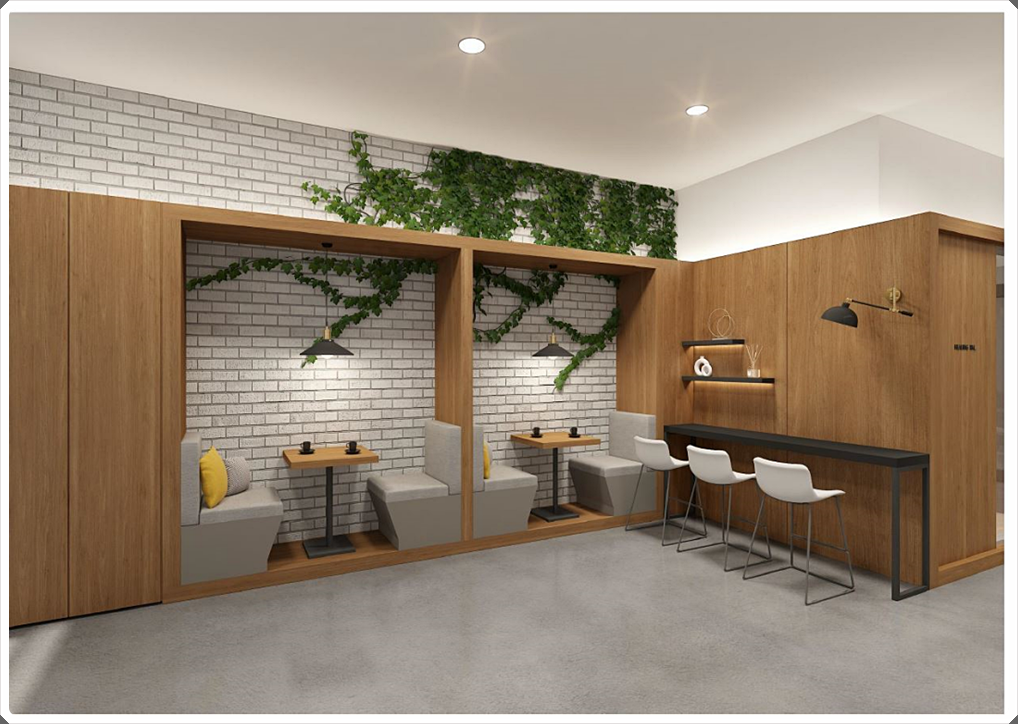 입구 파사드는 전체 유리로 구성하고 중간 중간에 간접 조명을 적용한 우드 프레임을 계획해 화사하면서 개방감이 느껴지는 휴게실 분위기를 표현했습니다. 도어 역시 벽면 디자인을 차용해 통일성을 줌으로써 확장성을 부여해 공간이 넓어 보이게 했습니다.