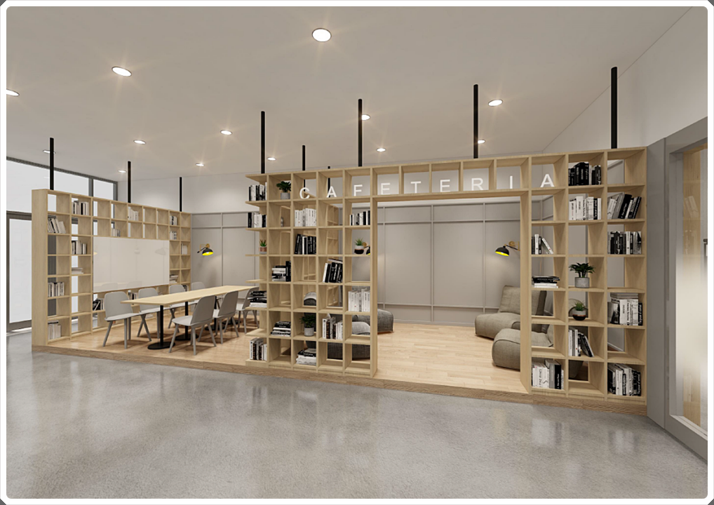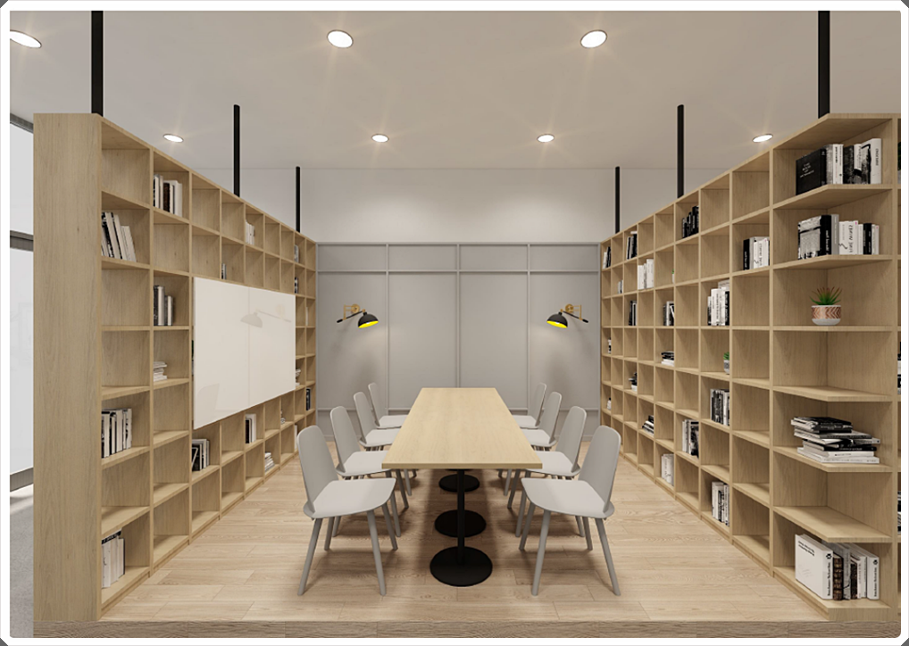 공간 구분은 가벽을 계획하는 대신 책장 형태의 우드 파티션으로 설계해 내추럴하면서 모던한 느낌의 도서관을 연상할 수 있게 했고 책장은 오픈형 디자인을 적용해 개방감을 부여함으로써 공간이 답답하지 않도록 했습니다.