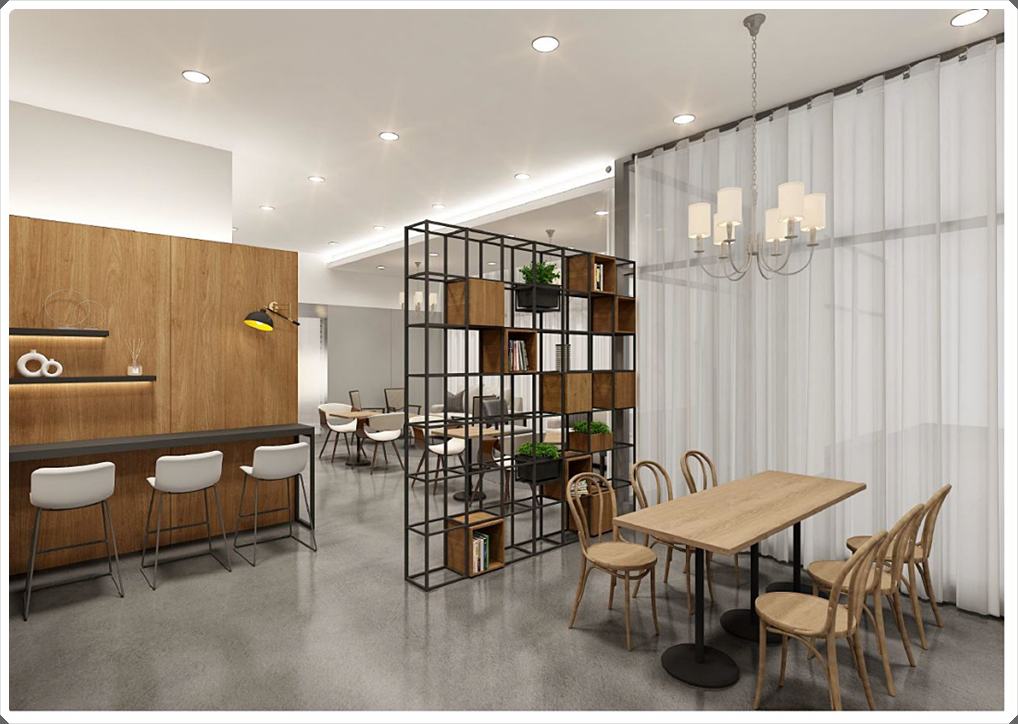 과거의 사무실인테리어라고 하면 업무에만 치중해 성과를 이끌어내는 딱딱한 분위기였다면 최근에는 자유로운 분위기에서 업무를 진행하면 좋은 성과로 이어진다는 생각으로 탕비실을 카페테리아 휴식공간으로 계획하는 곳도 많아졌습니다. 이번 디자인은 사옥의 휴게공간을 제안드렸던 부분이므로 오피스 공간보다는 카페테리아, 휴게 공간에 적용하는데 도움이 되었으면 합니다.