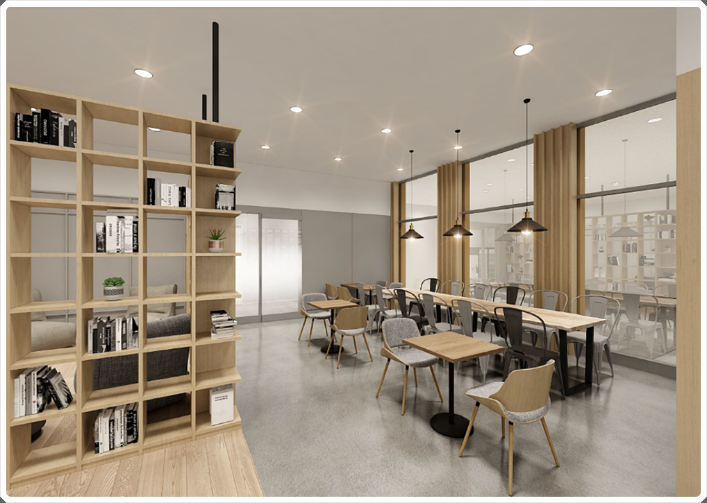 북카페, 스터디카페와 같은 분위기로 제안드린 두번째 안입니다. 대형 맞춤책장을 설계해 책과 자료를 수납할 수 있게 해 책도 읽고 쉴 수 있도록 제안드렸습니다.