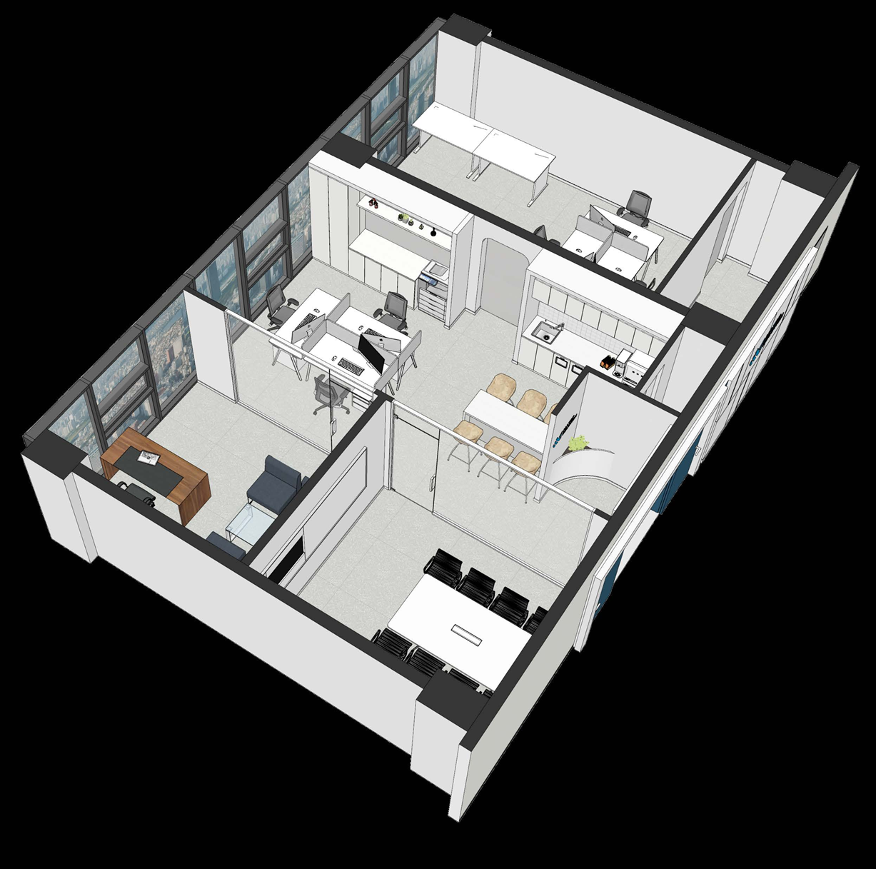 또한 모던한 디자인의 사무실은 공간을 최대한 활용할 수 있는 다양한 가구 배치와 조명을 통해 이루어집니다.
