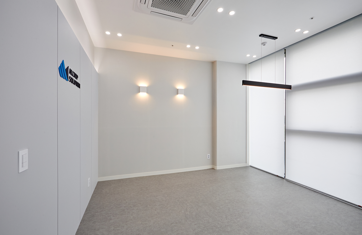 사무공간은 전반적으로 화이트 컬러를 중심으로 한 모던한 디자인으로 구성하였습니다. 가구와 벽체, 바닥 마감까지