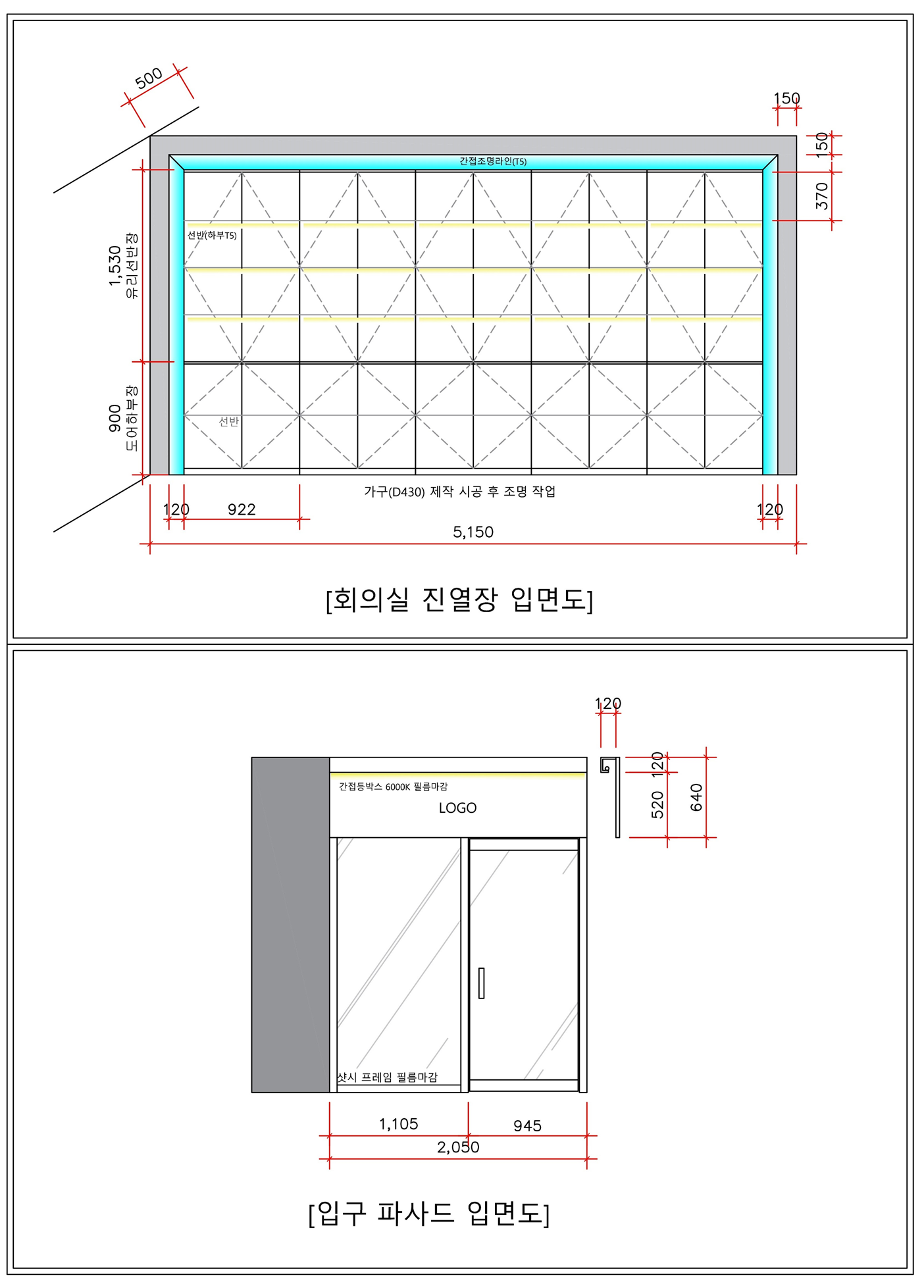 진열장 내부는 유리 선반 구조로 제작하여 투명감을 살렸으며, 후면 라이트 조명과 진열장 테두리에 적용된
