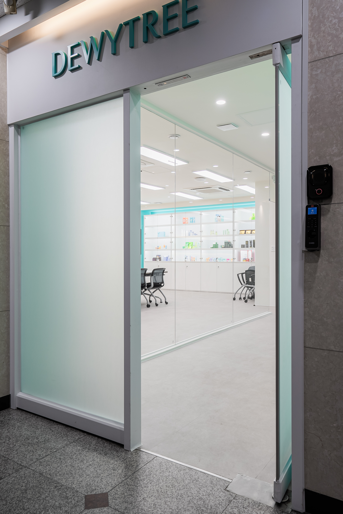 화이트 벽면 출입문 위에 기업 로고 사인물과 조명이 어우러져 세련된 첫인상을 전달하며,