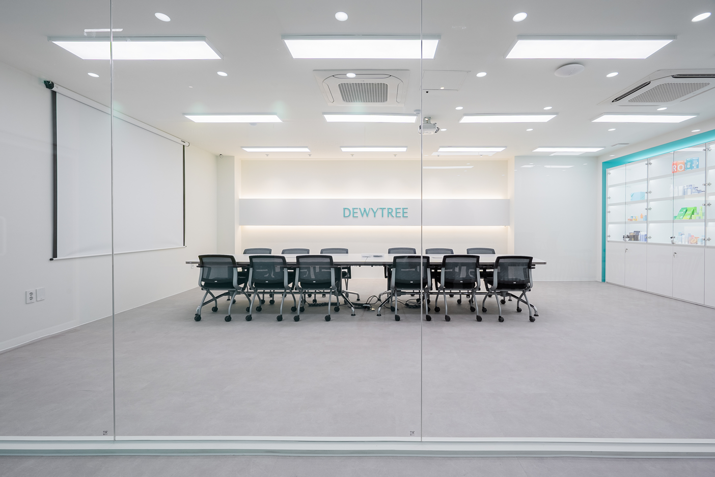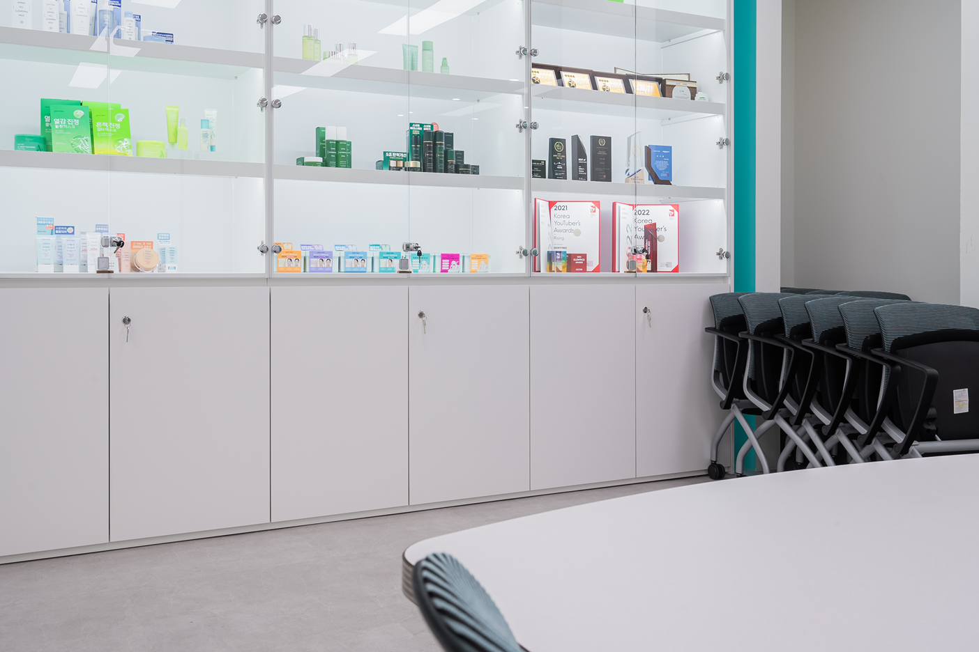 회의실 벽면에 설치된 진열장은 기업이 개발한 제품을 한눈에 볼 수 있는 전시공간으로 활용되어