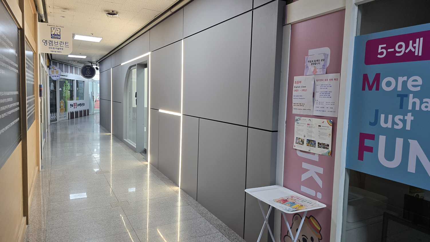 이번 영어학원은 차분한 그레이 컬러 벽면을 기본으로 하고, 세로와 가로로 교차하는 라인 조명을 활용해 단조로움을 깨주었습니다.
