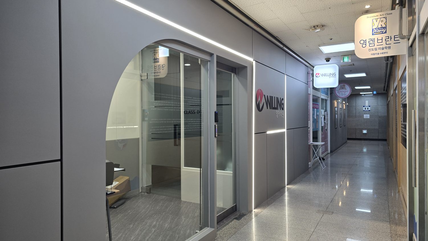 입구를 지나 내부로 들어서면 화이트와 그레이 투톤으로 꾸며진 복도가 학원을 안내합니다.