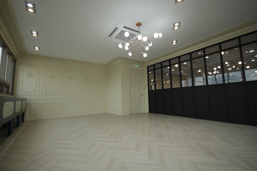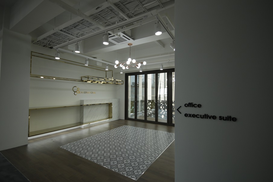 기업의 특성상 쇼룸 공간이 필요해 골드 컬러의 금속재와 유럽풍 타일, 우드 바닥을 적용해 고급스러우면서 안락한 분위기를 조성했고 다양한 조명을 적용해 입체적인 연출이 가능하도록 했습니다. 전면에는 폴딩도어를 활용하면 공간을 분리할 수도 개방할 수도 있어 효율적으로 사용할 수 있답니다.