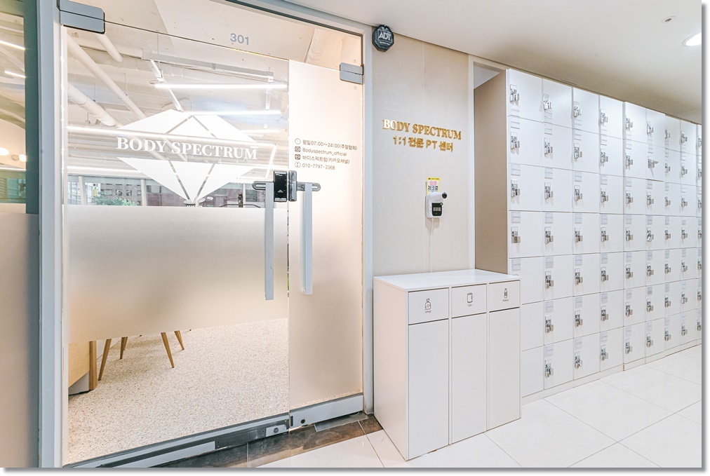 입구에서부터 화이트그린 포인트가 매력적인 하남 미사 분당 헬스장 피티샵인테리어가 완료된 모습을 살펴볼까요? 외부 파사드는 올 화이트를 적용했고 도어는 시트지를 시공한 유리로 시공해 개방성과 프라이버시를 모두 확보했습니다. 위드 코로나를 대비해 발열 체크기를 외부에 달았고 분리수거함을 배치해 외부 쓰레기의 유입을 막고 개인 락커를 외부에 설치해 실외화에 묻어있는 오염물질이나 먼지를 차단했습니다.