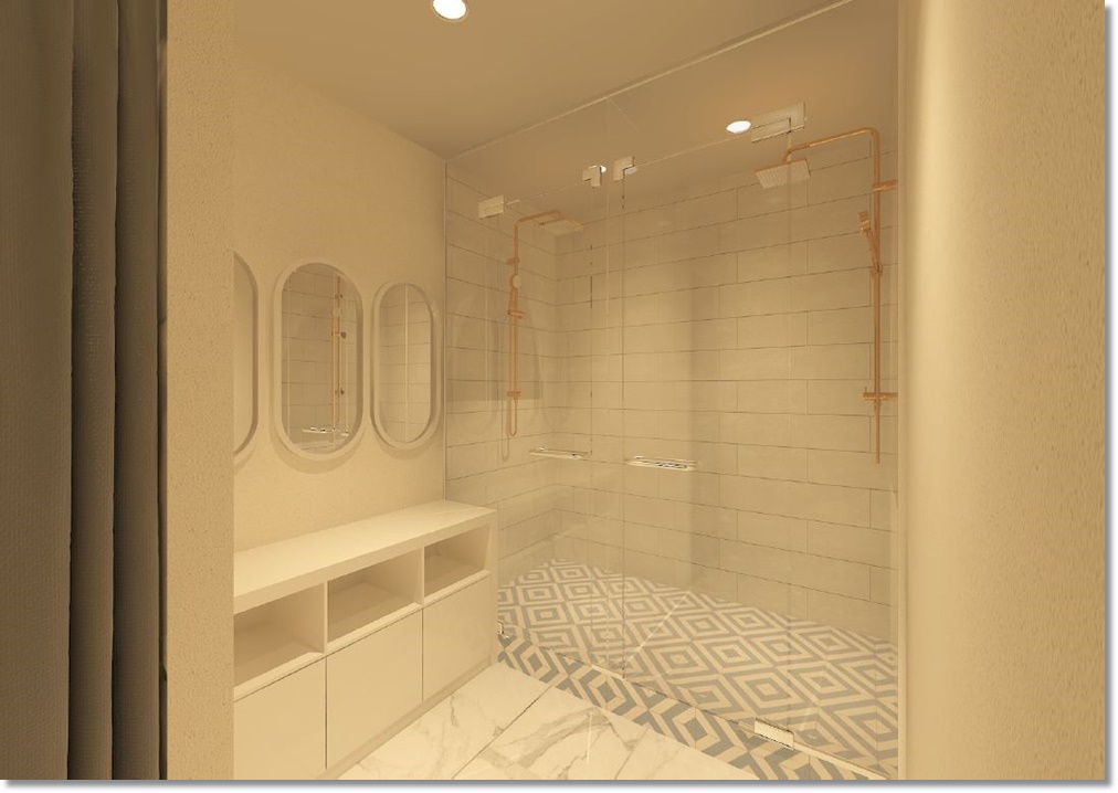입구쪽에 탈의실 및 샤워실을 배치해 운동 전후 이용할 수 있도록 함으로써 사용성과 편의성을 높였습니다. 샤워실은 개별 공간으로 계획해 프라이버시를 확보할 수 있도록 했고 바닥과 벽면 마감재는 물에 강한 타일을 적용했습니다.